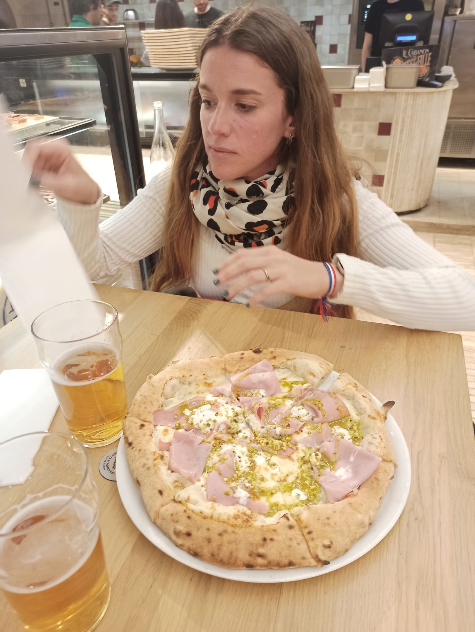 Chère Isabelle, Nous vous remercions sincèrement d'avoir pris le temps de partager votre expérience chez 500 Degrés Pizza, et nous sommes ravis que vous ayez apprécié nos pizzas. Nous sommes toutefois désolés d'apprendre que l'expérience globale n'a pas été à la hauteur de vos attentes en raison du manque de couverts, de serviettes, et de l'atmosphère dans les Halles du Vieux-Port le 1er janvier. Veuillez accepter nos excuses pour tout inconvénient rencontré. Le 1er janvier, avec l'affluence dans les Halles, a pu créer une ambiance différente de celle à laquelle vous vous attendiez. Nous comprenons l'importance de créer une atmosphère chaleureuse et confortable pour nos clients, et nous prendrons en considération vos commentaires pour améliorer nos services. Nous espérons avoir l'occasion de vous accueillir à nouveau et de vous offrir une expérience plus agréable. Cordialement, L'équipe de 500 Degrés Pizza - Marseille