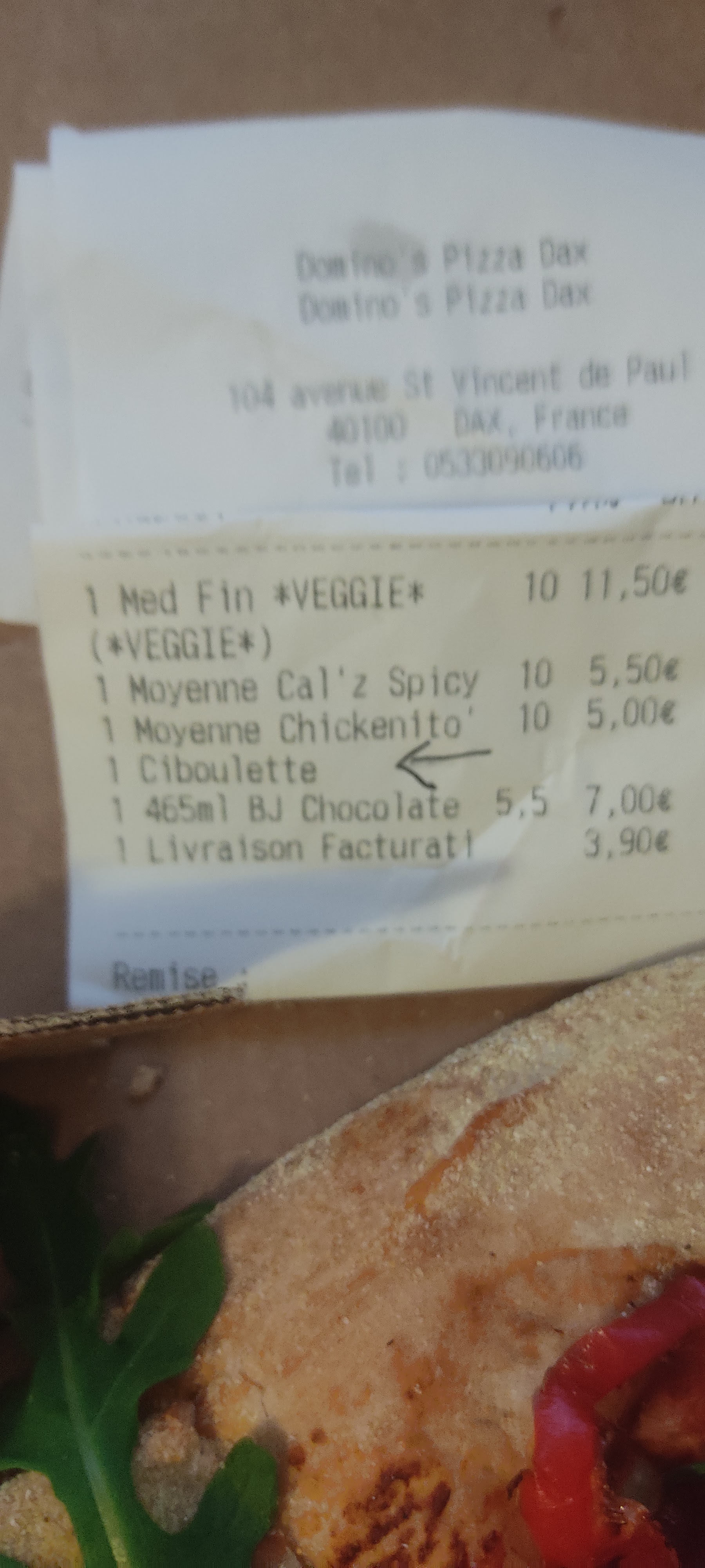 Bonjour, Merci à vous de votre commande et de votre avis. À très bientôt autour d’une bonne 🍕😉 L’équipe Domino’s Dax.