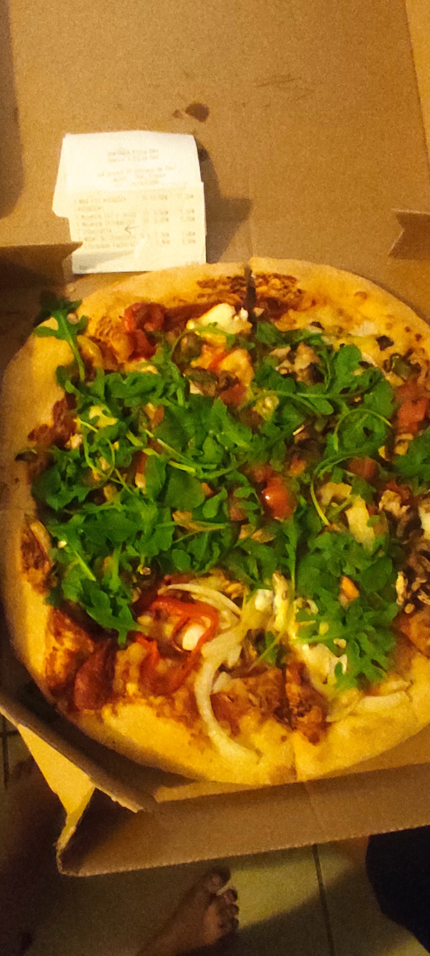 J'ai commandé des pizzas mardi, parfaites, donc jeudi en sortant du travail fatiguées, nous avons répété encore, une pizza au chèvre avec du miel et du bacon, et une carnivore, décevante, la pâte plus fine qu'un papier, presque pas. ingrédients, en conclusion super décevant ! Et j'ai commandé de la pâte normale et nous avons mangé du papier !