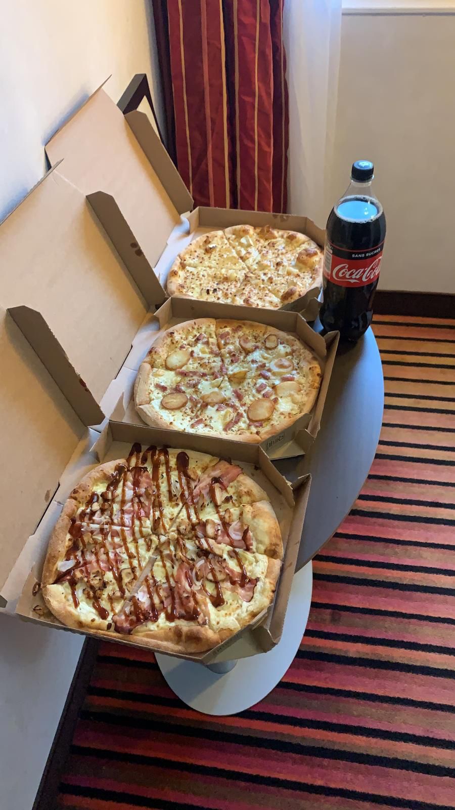 J'ai commandé à emporter. Une fois à la maison, j'ai découvert qu'ils se sont trompés sur 1 pizza. Ils m'ont livré la bonne très rapidement avec leurs excuses. Les pizzas sont très bonnes et le personnel est très serviable.