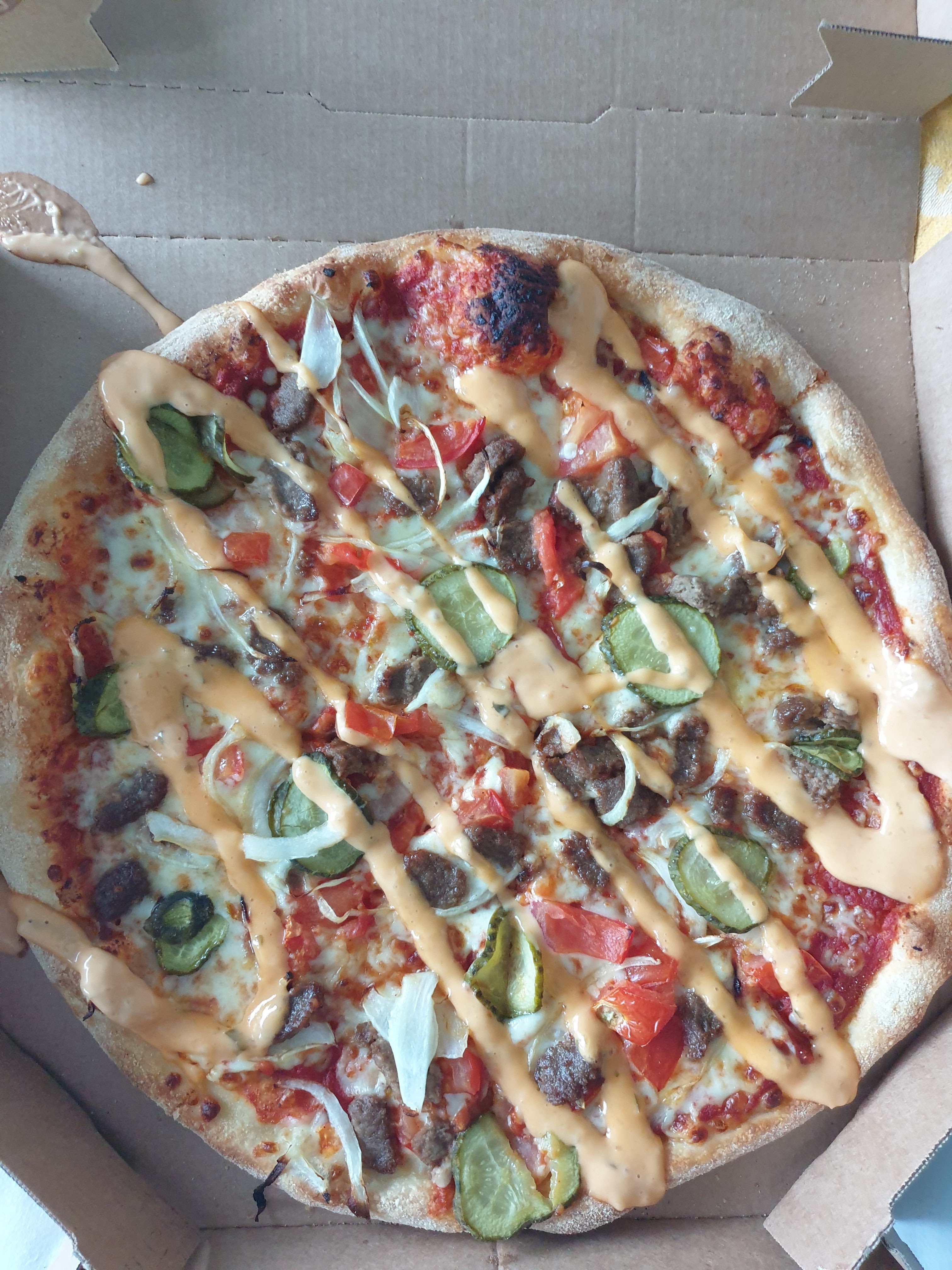 Ma pizza était excellente, une Spicy Dallas Burger , attente assez long après le délai prévu