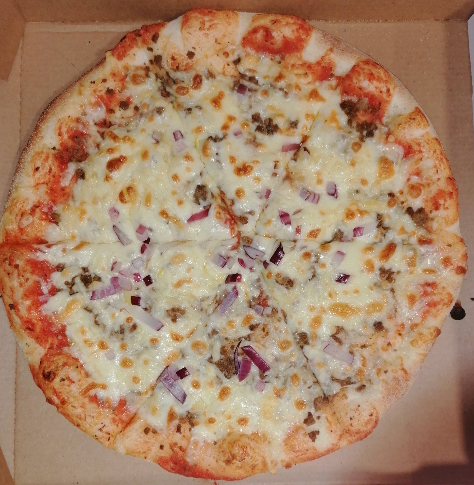 Pizza bon rapport qualité prix pâte à base de semoule très bon manque juste un peu plus de garniture mais pour le prix la qualité et le goût sont au rendez-vous.