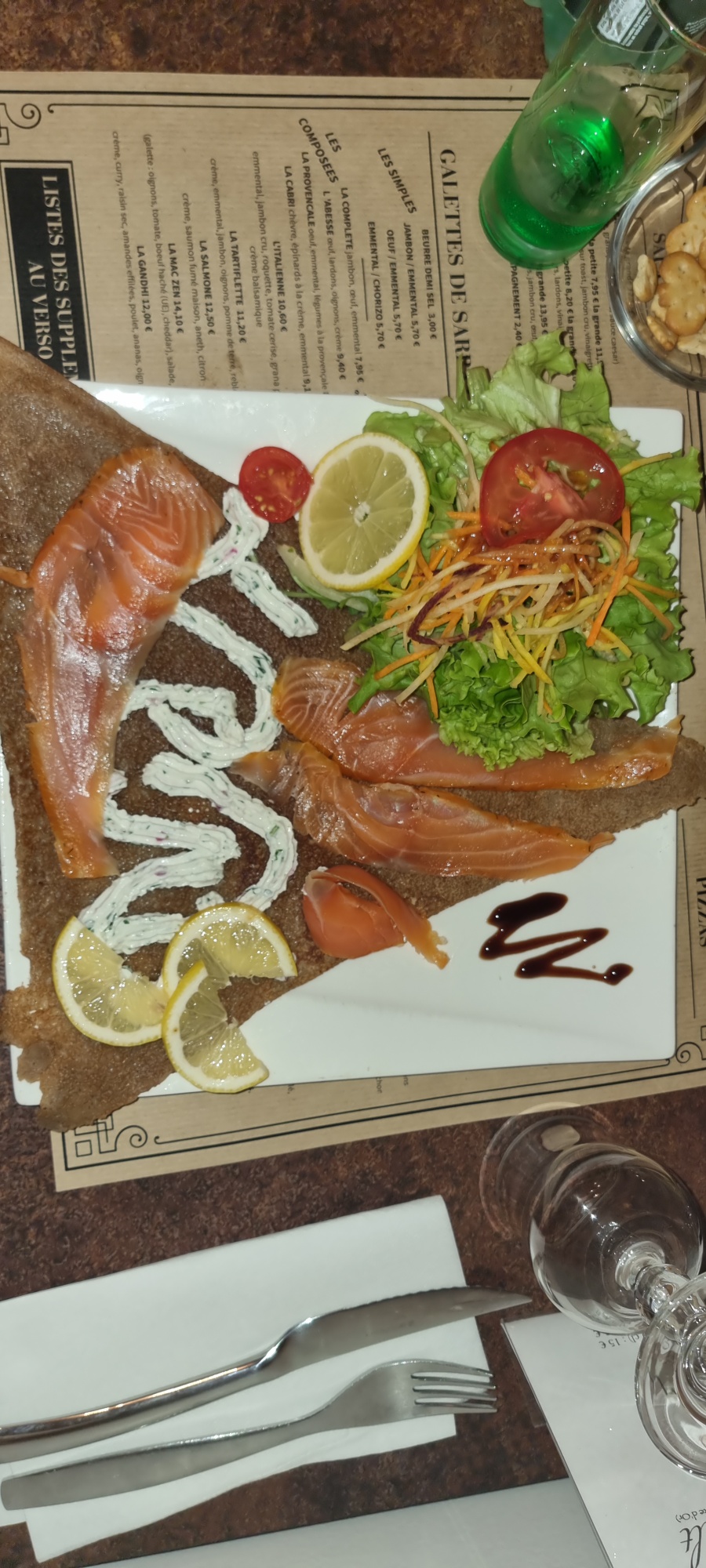 Très belle surprise dans ce restaurant. On a réservé pour 11 personnes. Accueil chaleureux, on nous laisse le temps de choisir. La cuisine était excellente. On sent vraiment que les aliments sont faits maison. Je suis un grand mangeur et la galette Mac Zen m’a callé. Merci pour la photo de table prise par le cuisinier. Et merci à la gérante pour l’explication de la Pizza Flambé 😂😂😂. Une Pizza, que l’on flambe. Très bon moment partagé dans cette endroit. Je reviendrais. Les prix sont abordable, et les quantités vraiment généreuse.