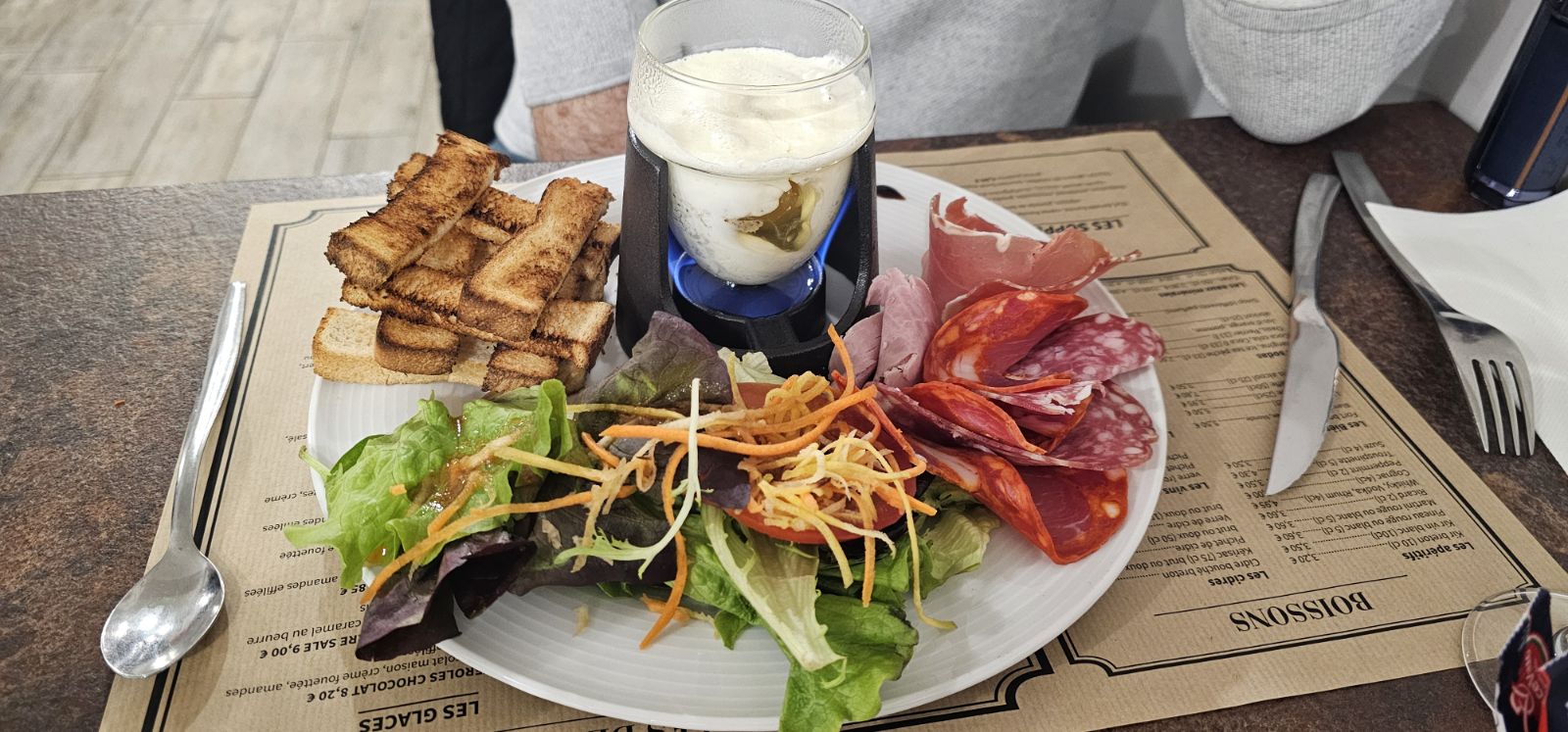 Service long . Lieu assez bruillant. Cuisine correct . Patio fermé non disponible alors que le temps ne permet. Service décalée a chaque table. Cependant le rapport qualite quantite et prix parait juste . Restaurant que l on qualifierai de cantine familiale . Le cidre est servi dans des verres à vin . L appellation. Du restaurant pourrai faire penser a une creperie mais il s agit plutôt d une brasserie au vu de la carte ce qui permet d avoir du choix . Nous leur souhaitons de progresser dans le service avec le temps.