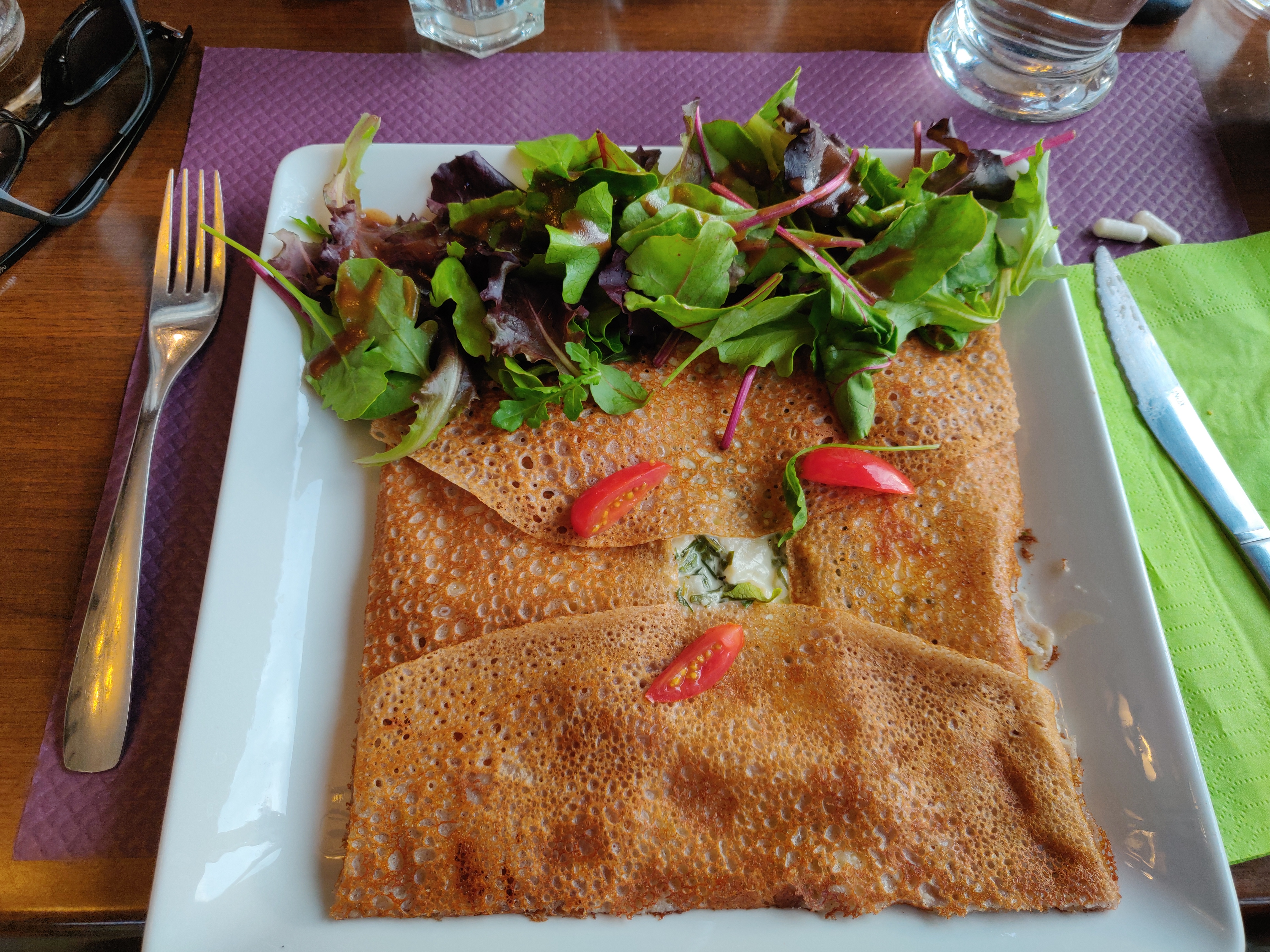 Un accueil très sympathique, tous le personnel est très agréable. Grands choix de galettes, crêpes, salades et pizzas. Y compris pour les végétariens (sans viande, av. poissons, œufs et produits laitiers). Les portions sont généreuses et les desserts très bons.