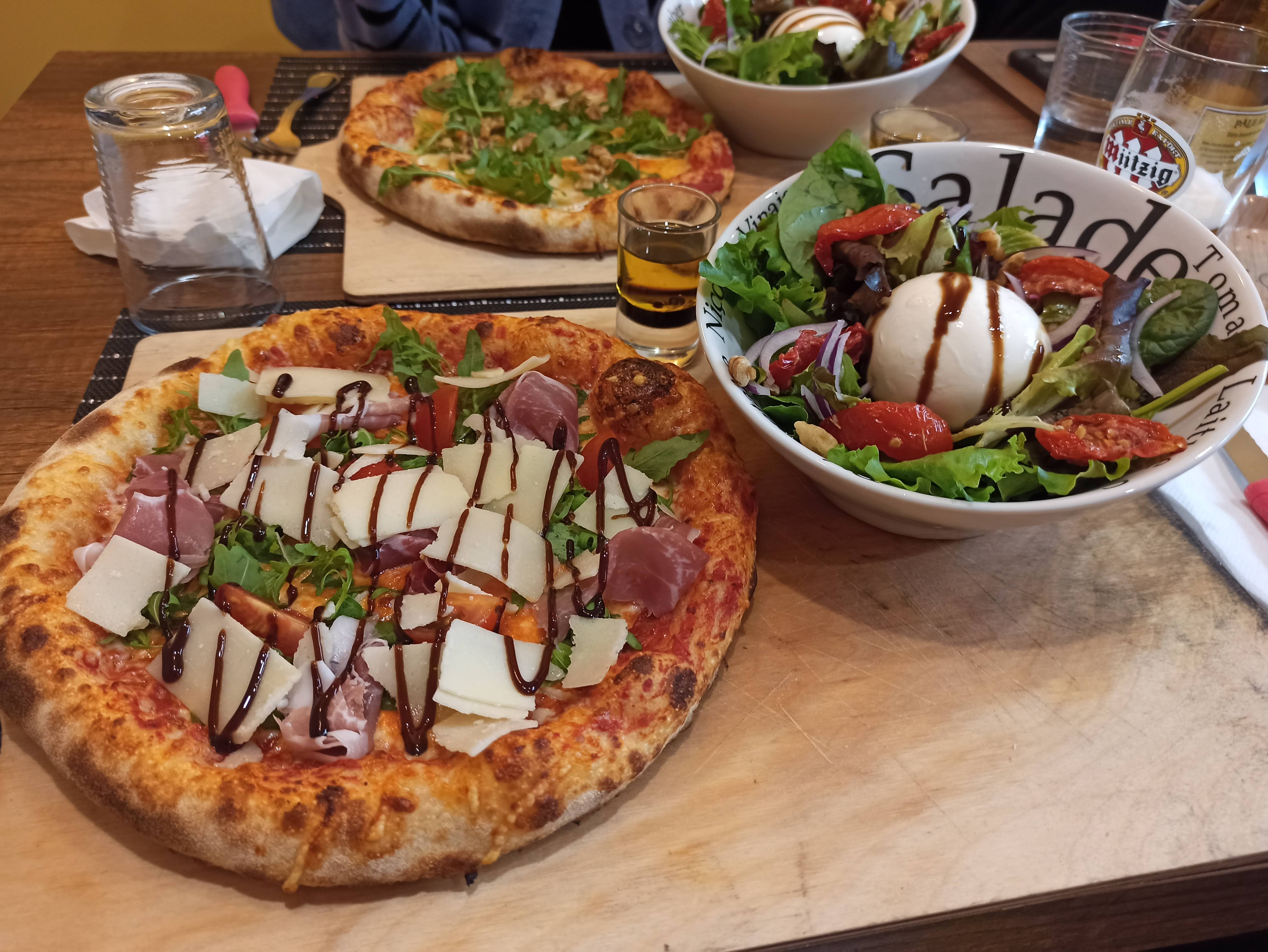 Pizza et salades délicieuses . Une belle découverte sur Hangenbieten.