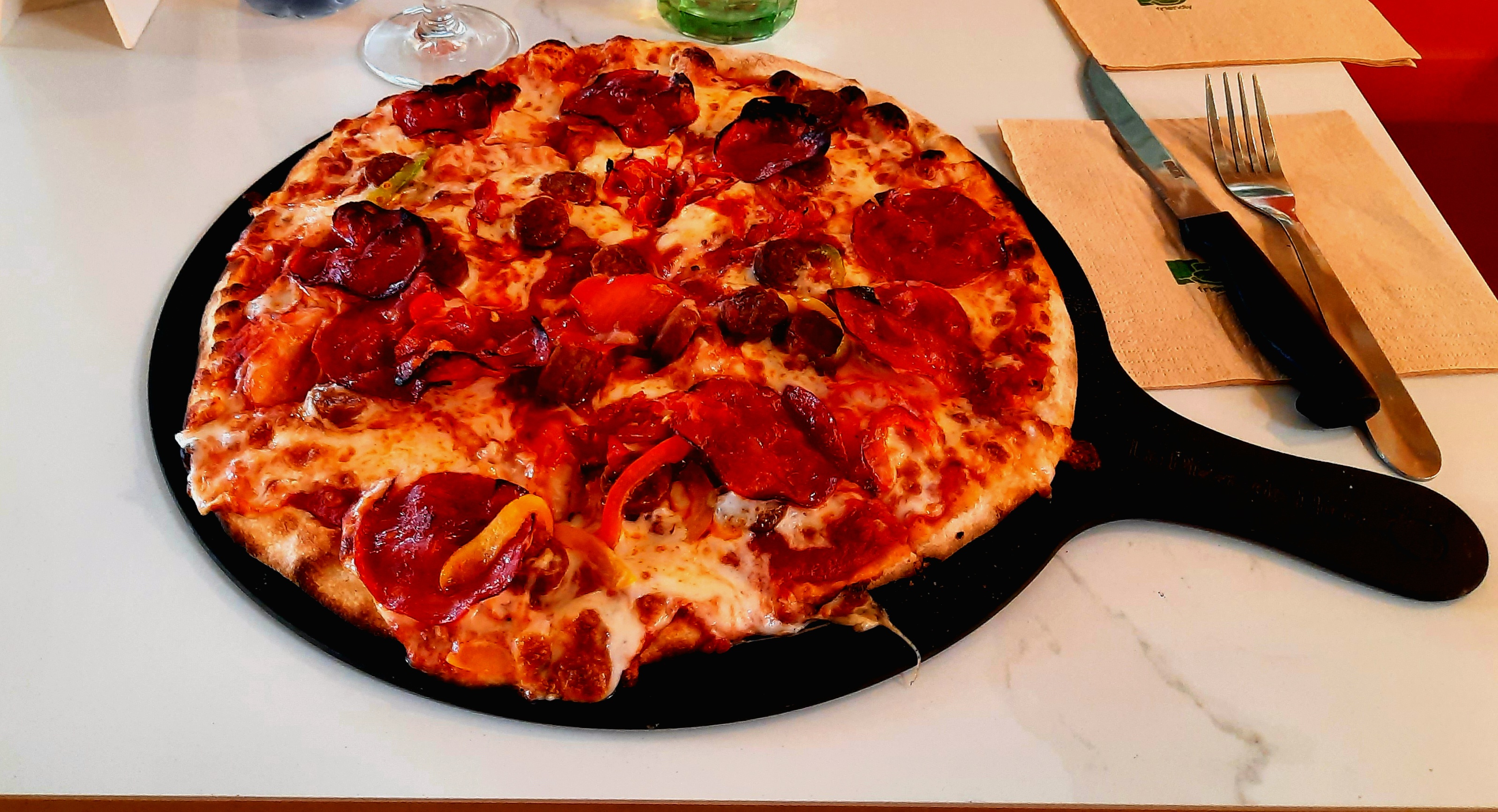 Pizza pas très copieusement garnie, qualité correcte mais pour moi il y a mieux, et lieu qui tient un peu trop d'un fast food. Correct mais pas transcendantal