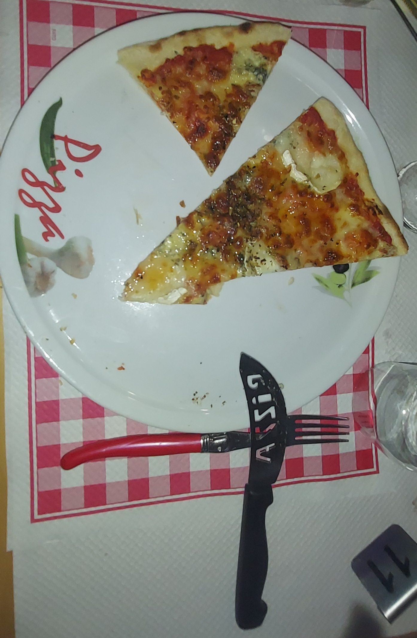 Pizza XXL et très bonne (je suis très difficile pourtant) accueil chaleureux et sympathique. Pour info il y a une assiette de 30 cm qui se trouve sous cette excellente pizza d environ 40 cm. Dessert XXL. Ambiance familiale. Nous avons découvert cet endroit car invité par nos amis TOM & GIGI que nous remercions chaleureusement. Très très bonne adresse à retenir. Merci