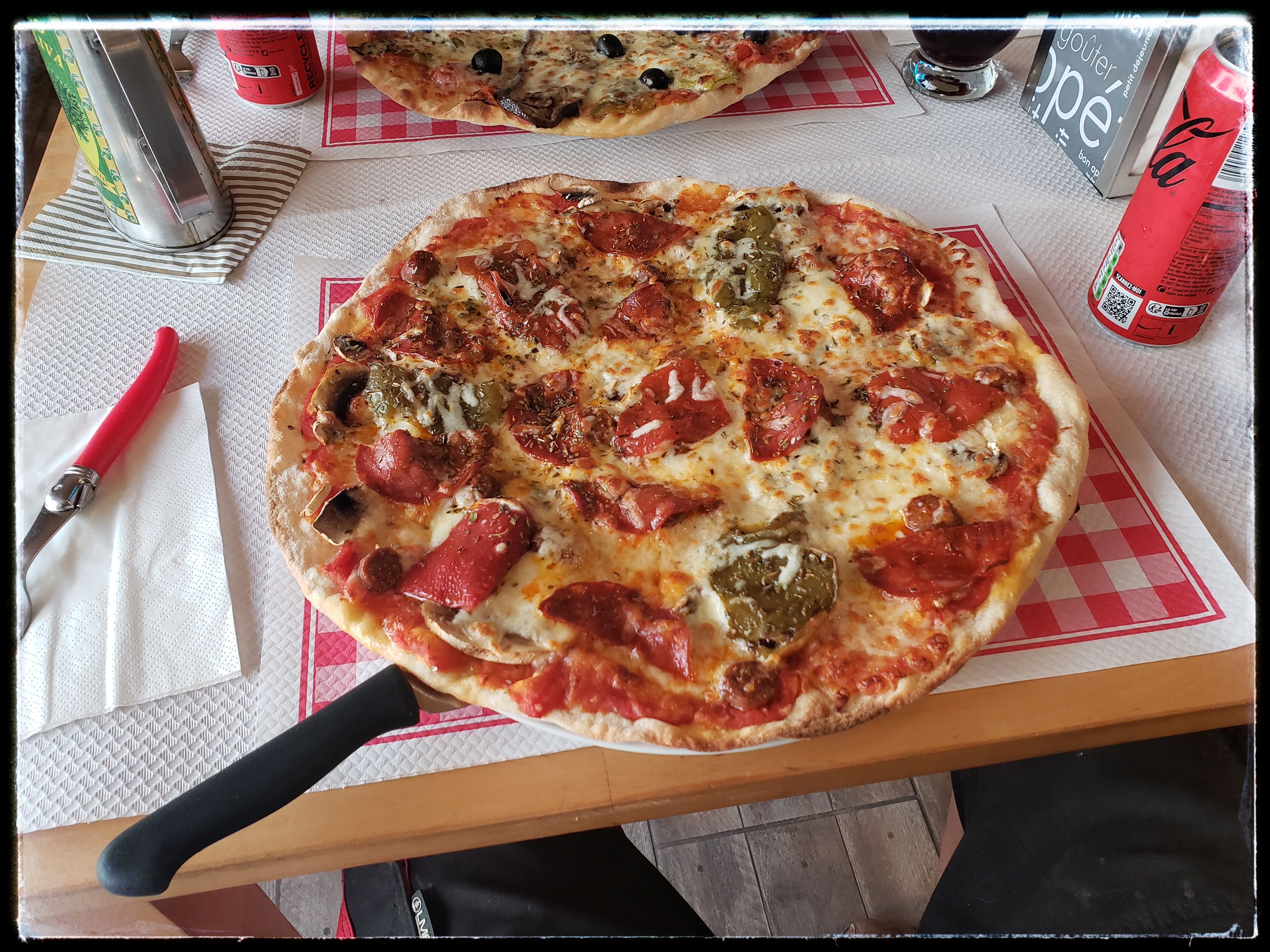 Pizzas super bonnes et très copieuses. On est très loin des pizzas surgelées,et tout cela pour un prix très raisonnable. L'accueil était magique, on se serait crû en famille. Félicitations à ce gentil petit couple. Si on était de la région,nous y serions très souvent. Bravo.