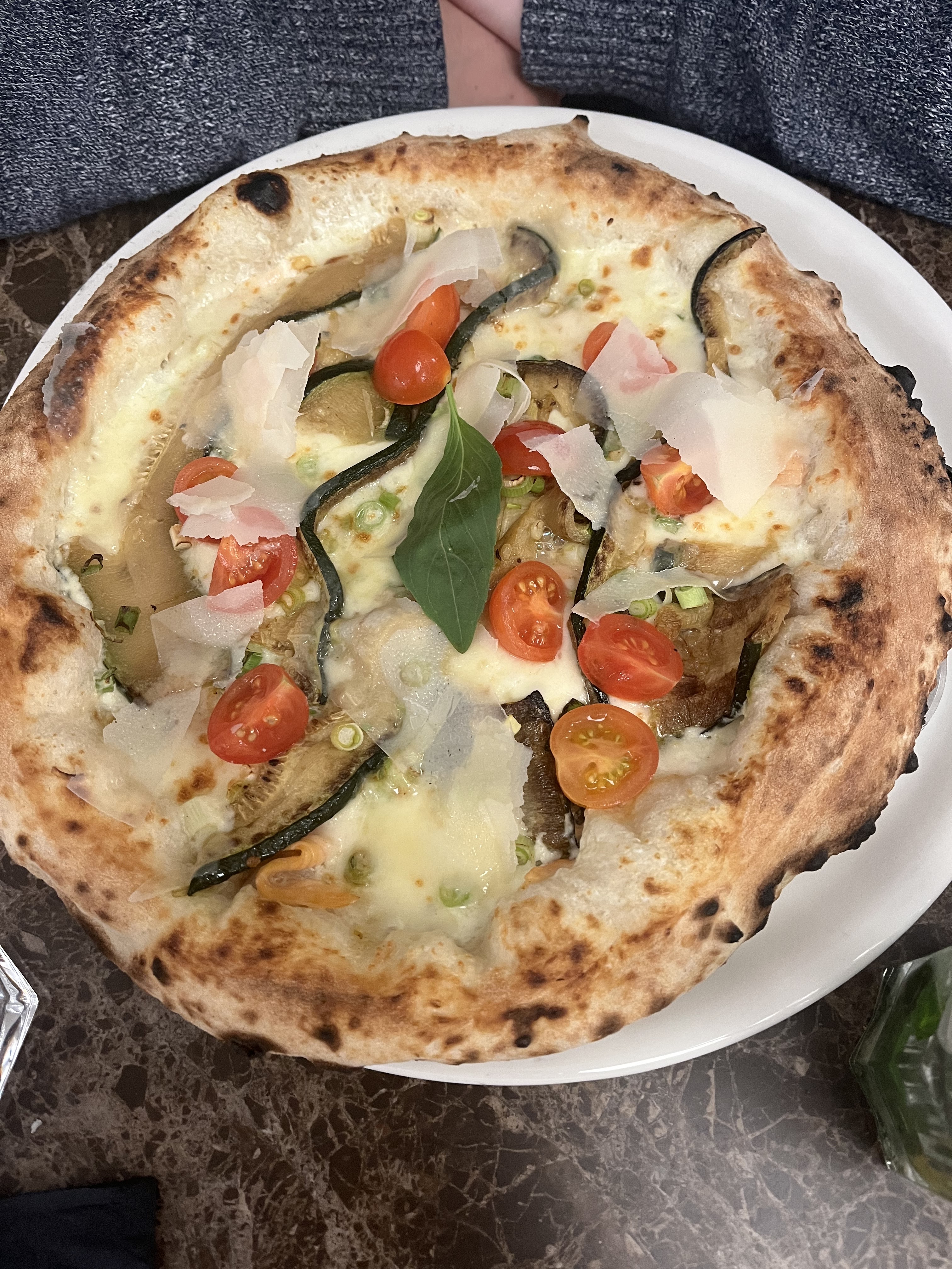 Pâte à pizza levée pendant 4 jours! Légumes frais et fromages italiens de grande qualité. Service très convivial et pizzaiolo heureux de partager. Grazie mille!