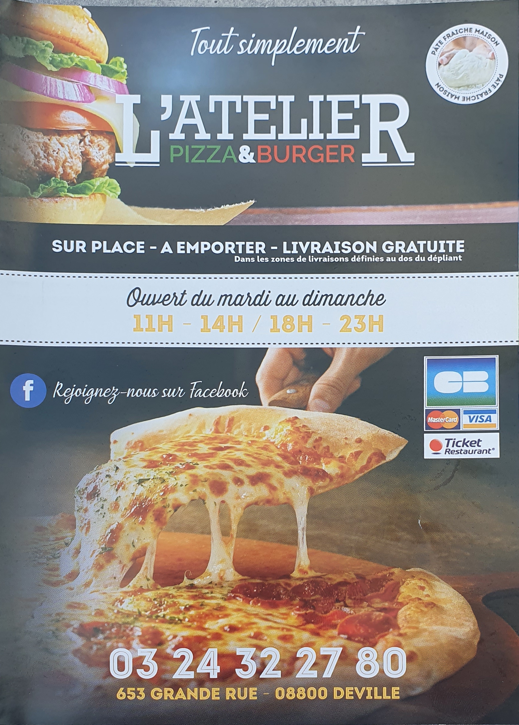 Voici toutes les informations sur le Pizzeria L'atelier Pizza & Burger qui ce trouve au 653 Grand Rue, 08800 Deville (08). Sur cette fiche vous trouverez les photos, l'adresse, les horaires d'ouverture, le numero de téléphone et les avis clients.Vous pouvez églement rédiger un avis si vous le souhaitez en bas de page.