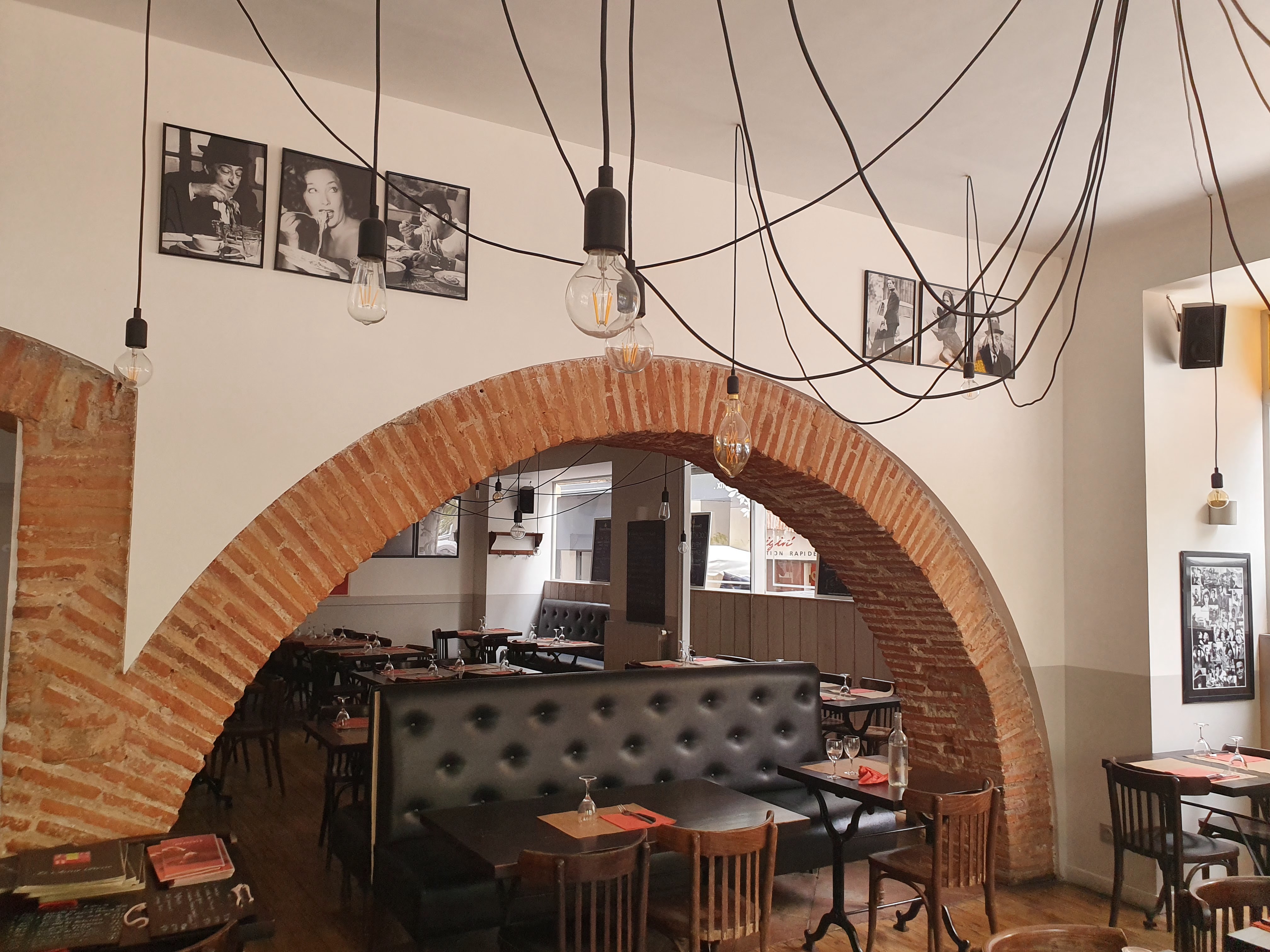 Restaurant pizzeria. Terrasse à l'ombre en été sur la place piétonne de la Libération . Salle décorée avec des photos d'acteurs italiens mythiques, chaleureuse par les froides soirées d'hiver.