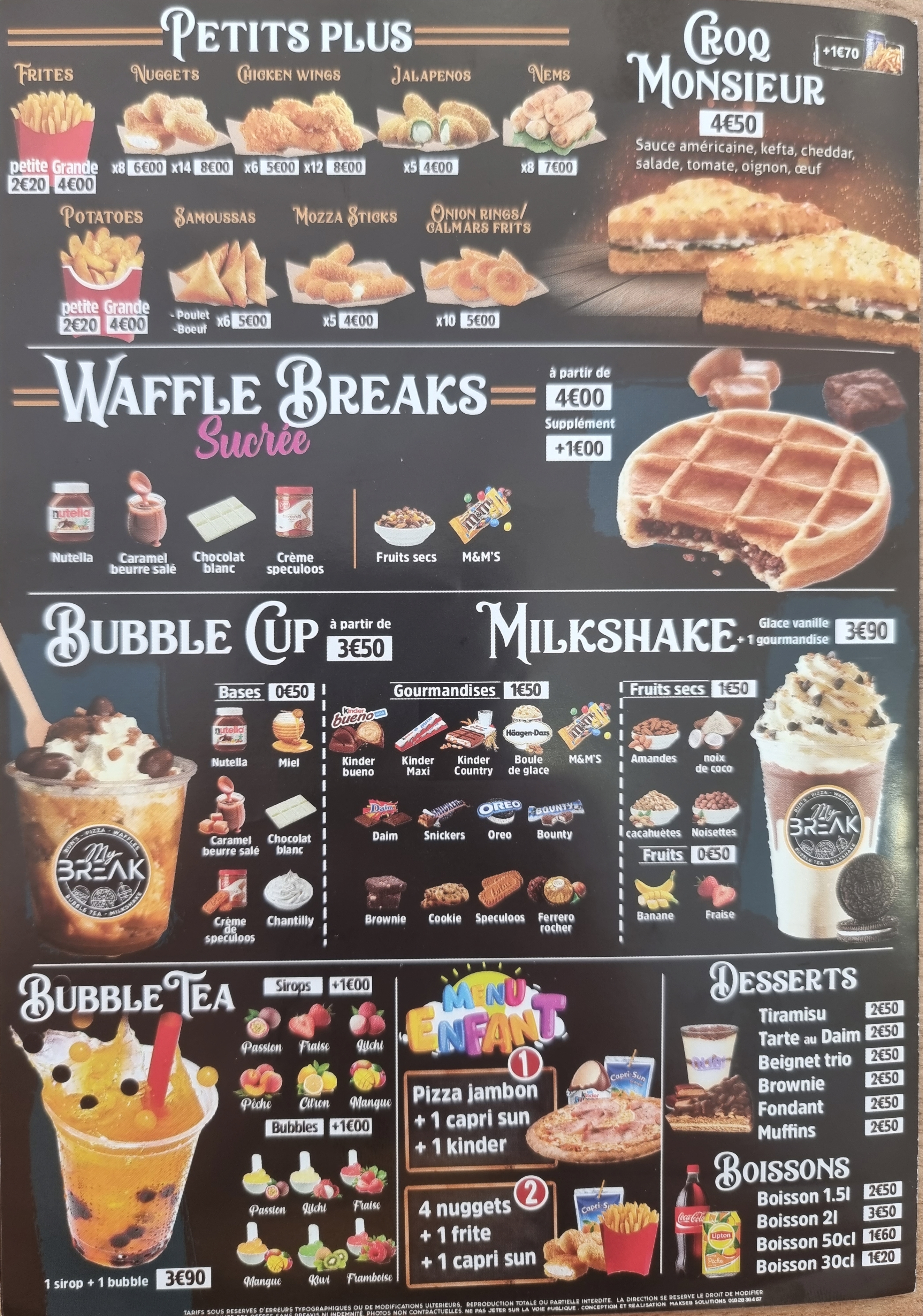 Soirée entre amis je commande des pizzas🍕tout le monde s'accorde à dire qu'elles sont excellentes😋 Les waffles ça change j'ai adoré 🤗 Service et amabilité au top👍 Merciiiii my Break
