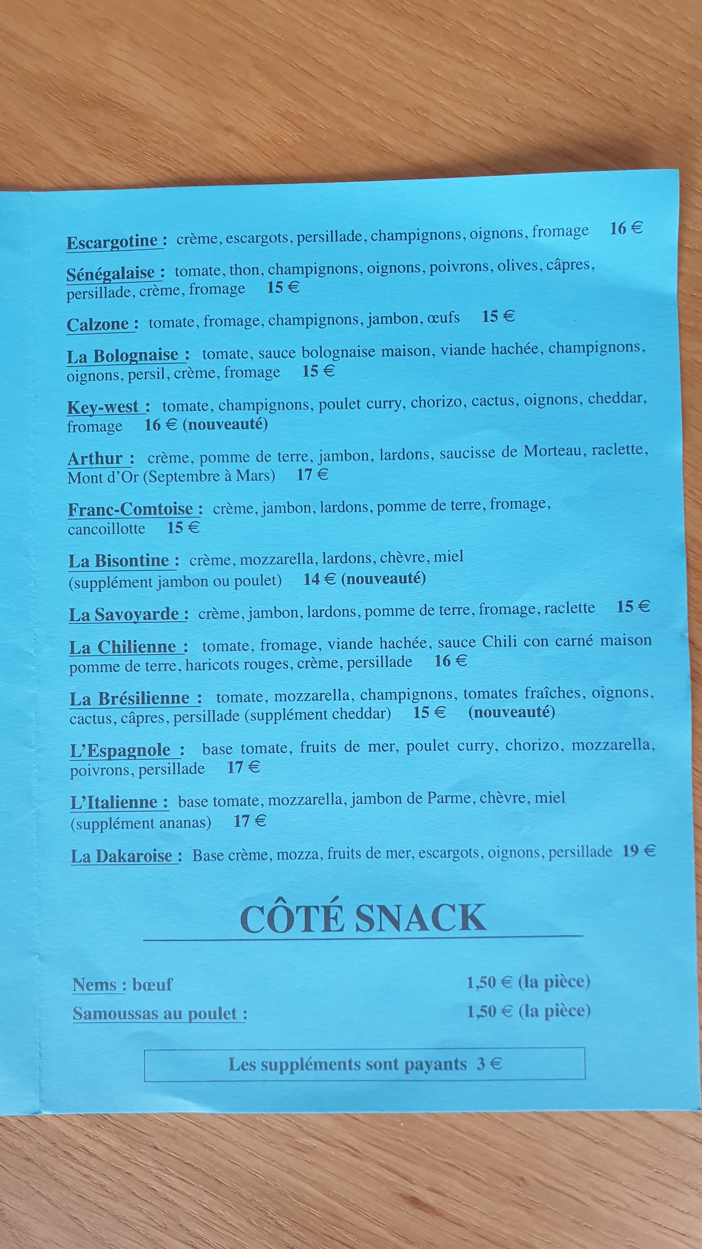 Notre curiosité piquée par des notes dignes d’un étoilé nous allons faire un tour chez cette dame dans son bus qui lui sert de camion pizzas en ce dimanche soir de passage sur Saint Vit. Eh bé.. quelle déception ! Pizzas à la pâte peu maturée et garniture certes généreuse car discount. L’ensemble fait des pizzas relativement chères (15€ de moyenne pour seulement 29 cm de diamètre) sans grande valeur culinaire et qui se mangent quand on a faim.. J’avais envie de me sauver quand j’ai vu la gérante répondre à son téléphone et reprendre en cuisine juste après sans désinfection mais bon.. par chance nous n’avons pas été malades même si la digestion était suspecte car difficile quand même. Les autres spécialités de la « maison » n’ont pas été goûtées et ça ne risque pas d’être le cas pour nous !