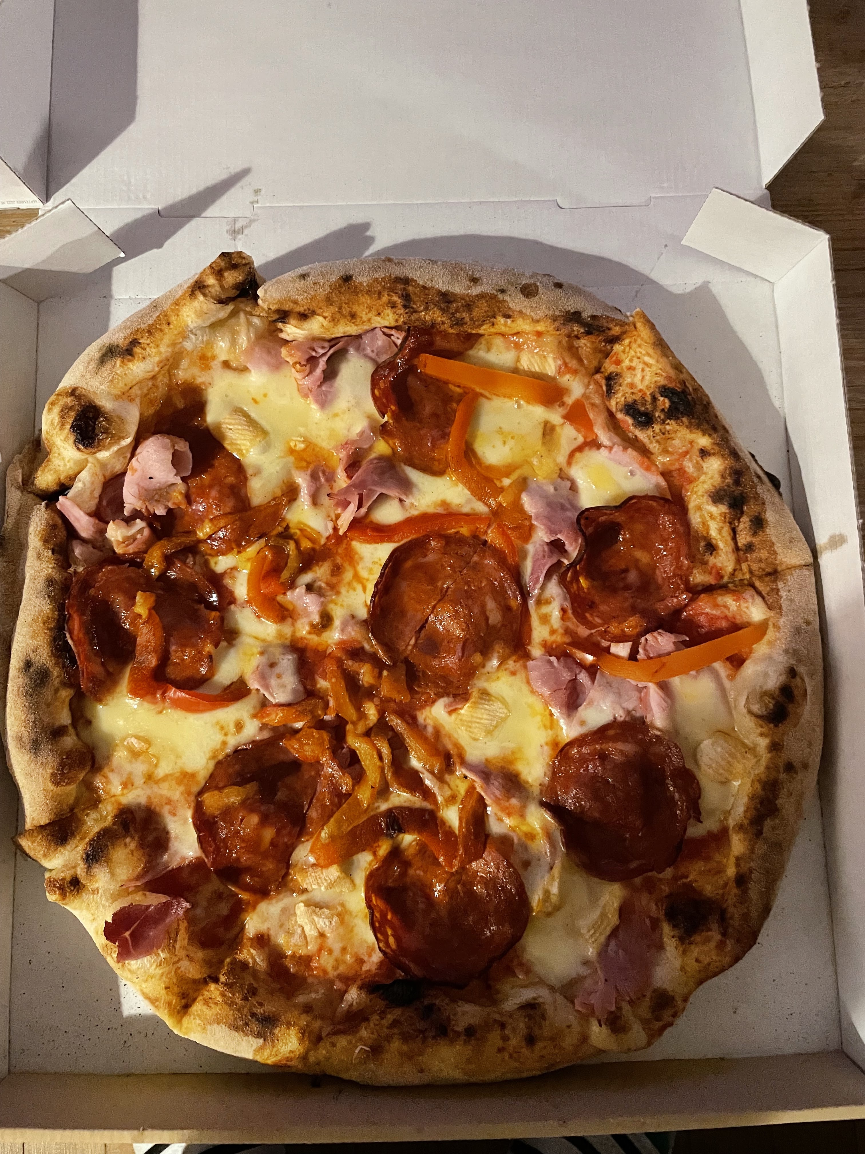 Très bonne pizza, la pâte est moelleuse, fondante...bien garnie avec des produits de qualité, et ce four à bois lui donne un goût sublime. Vraiment excellente !! Livraison rapide et sympathique 😉
