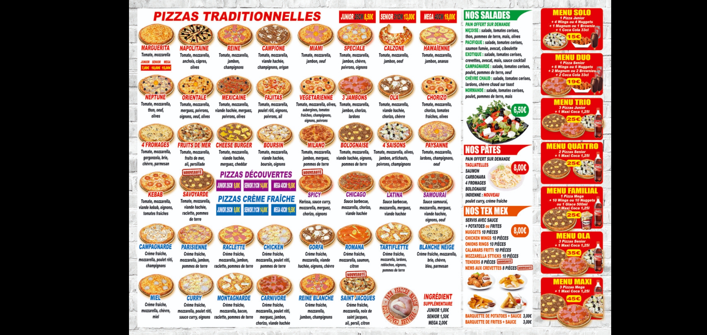 Pizzas exelentes très large choix et livraison respectant les délais annoncé je recommande fortement.