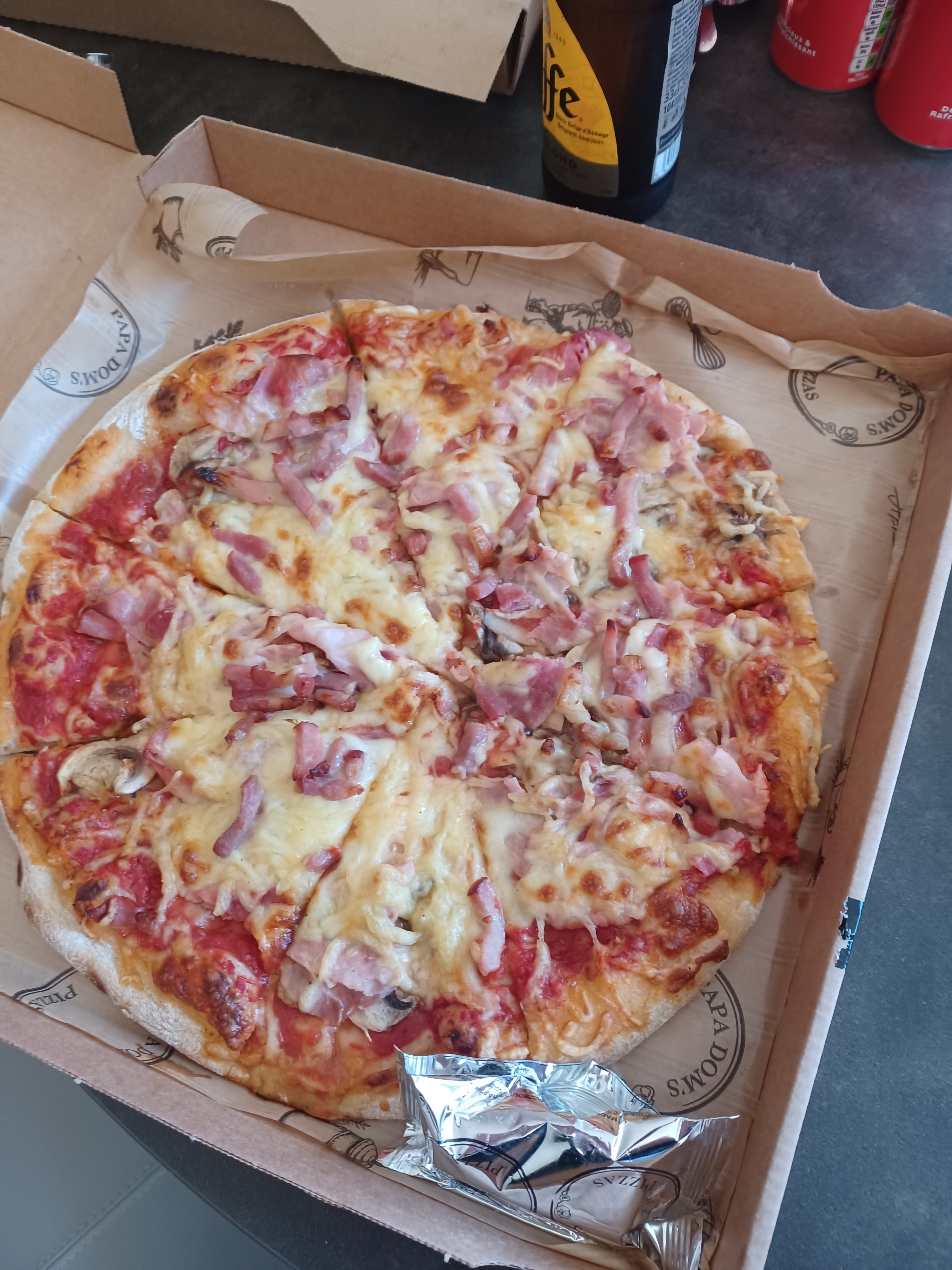 En déplacement professionnel, j'avoue avoir commandé chez papa doms par hasard. J'ai regardé la distance et la facilité pour se garer. Il y a aussi beaucoup de choix ! J'ai pris la pizza saveur d'automne et je ne regrette pas ! La pizza a une pâte moelleuse et la garniture est plus que généreuse ! Chapeau bas ! Personnels très agréable et accueillant également