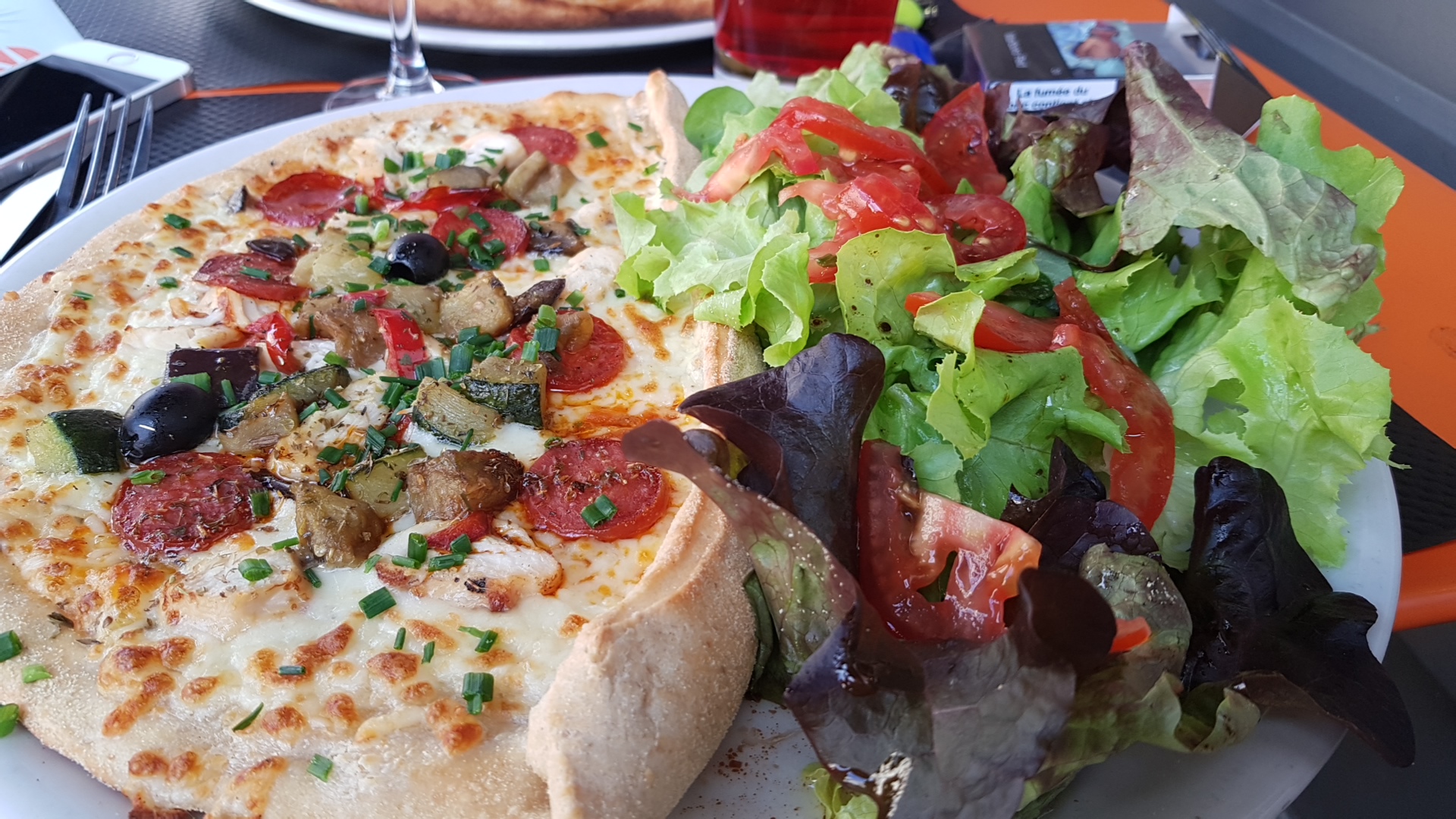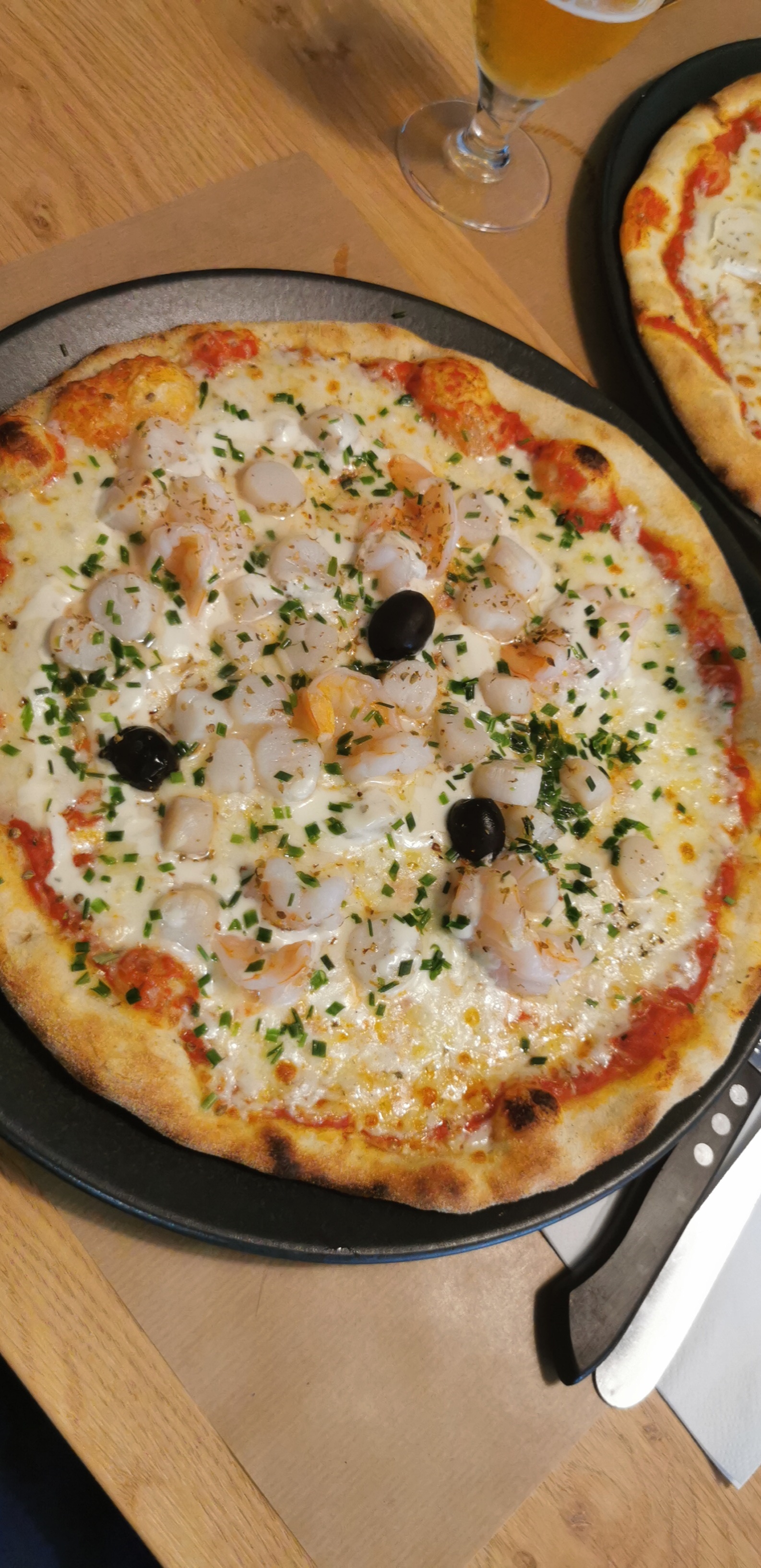 J'ai pris une grande pizza, très copieux garni des coquilles et des crevettes. Ma femme une demie et une salade. Normalement nous mangeons très peu la pizza, mais ce soir nous avons fait une découverte : délicieux, copieux et le brigade noir était très très gentil et poli. Chapeau !