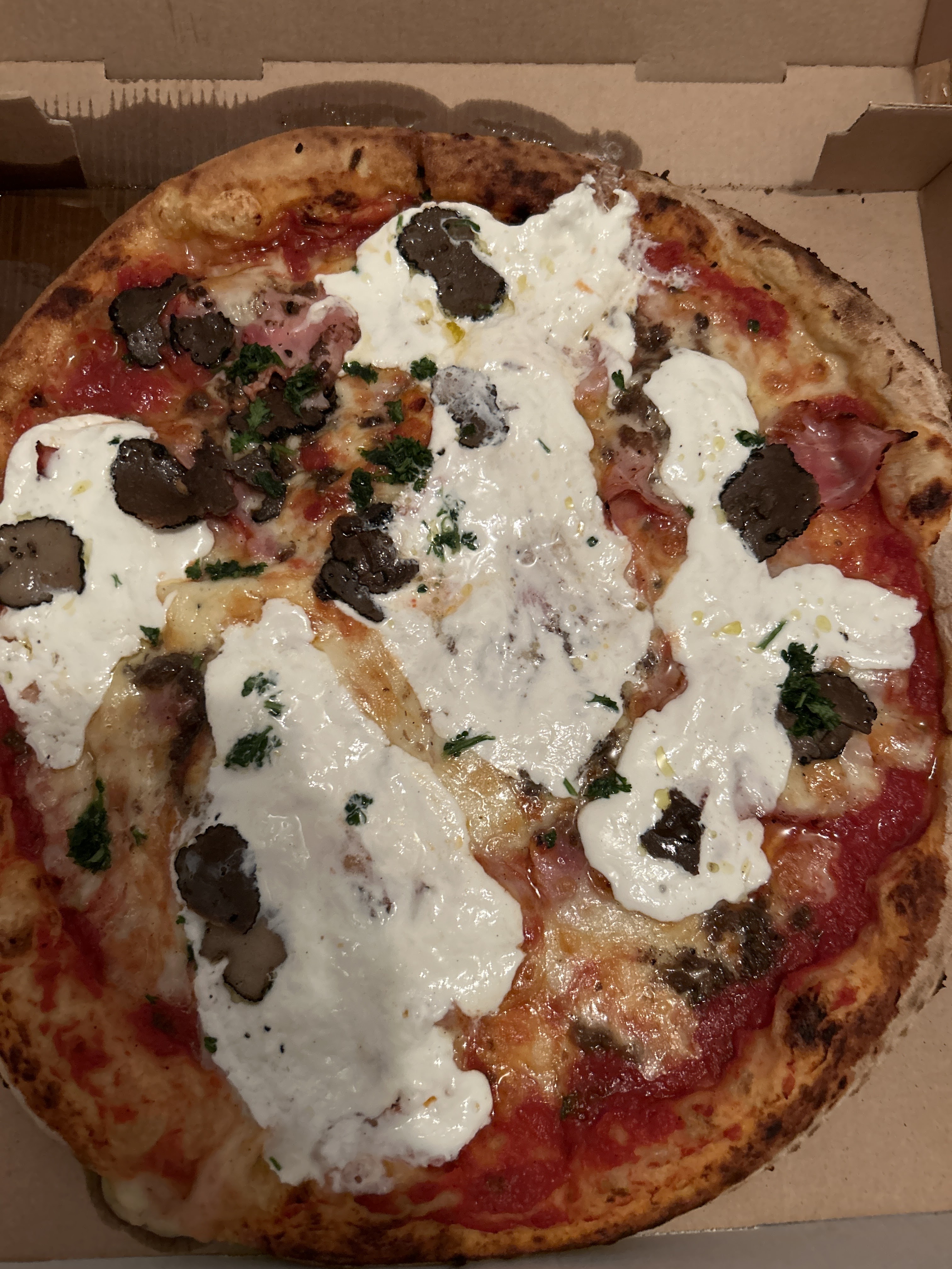 J'ai commandé le Pizza Truffette pour livraison. Croûte généreuse, croustillante et moelleuse. Les garnitures se combinent bien pour une expérience délicieuse et satisfaisante. Ça n'a pas duré longtemps