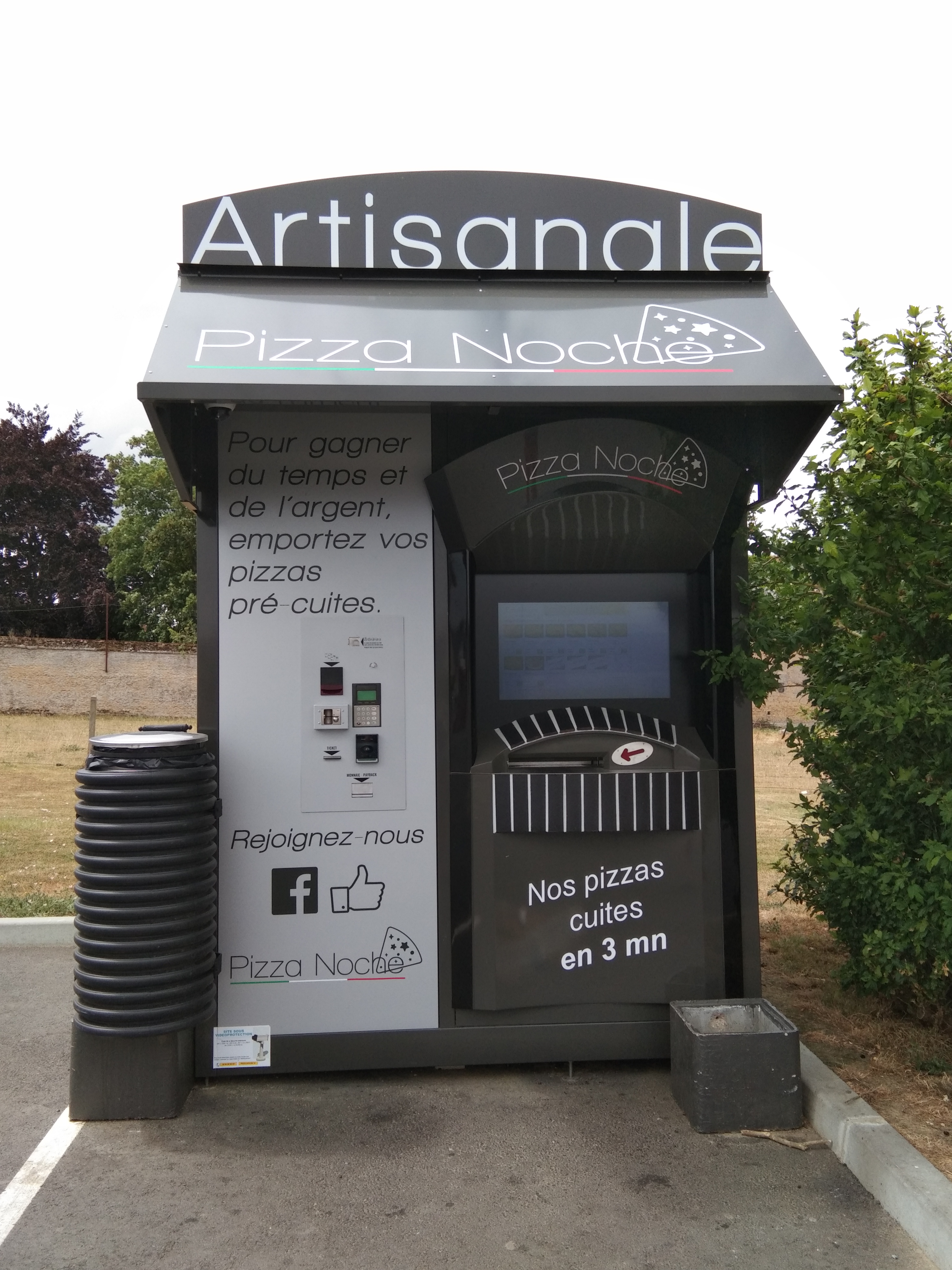Distributeur de pizza situé sur le parking du Casino. Facilité d'accès. Compréhension rapide (tactile) et choix de paiement (CB, espèce). 10€20 la pizza, même choix qu'il y a deux ans (image sur un autre commentaire), réduction de 11h à 14h en semaine donc on en a eu pour 15€60 les deux pizzas. Je recommande car rapidité, bien chaudes, et conformes (taille : moyenne, ingrédients OK).