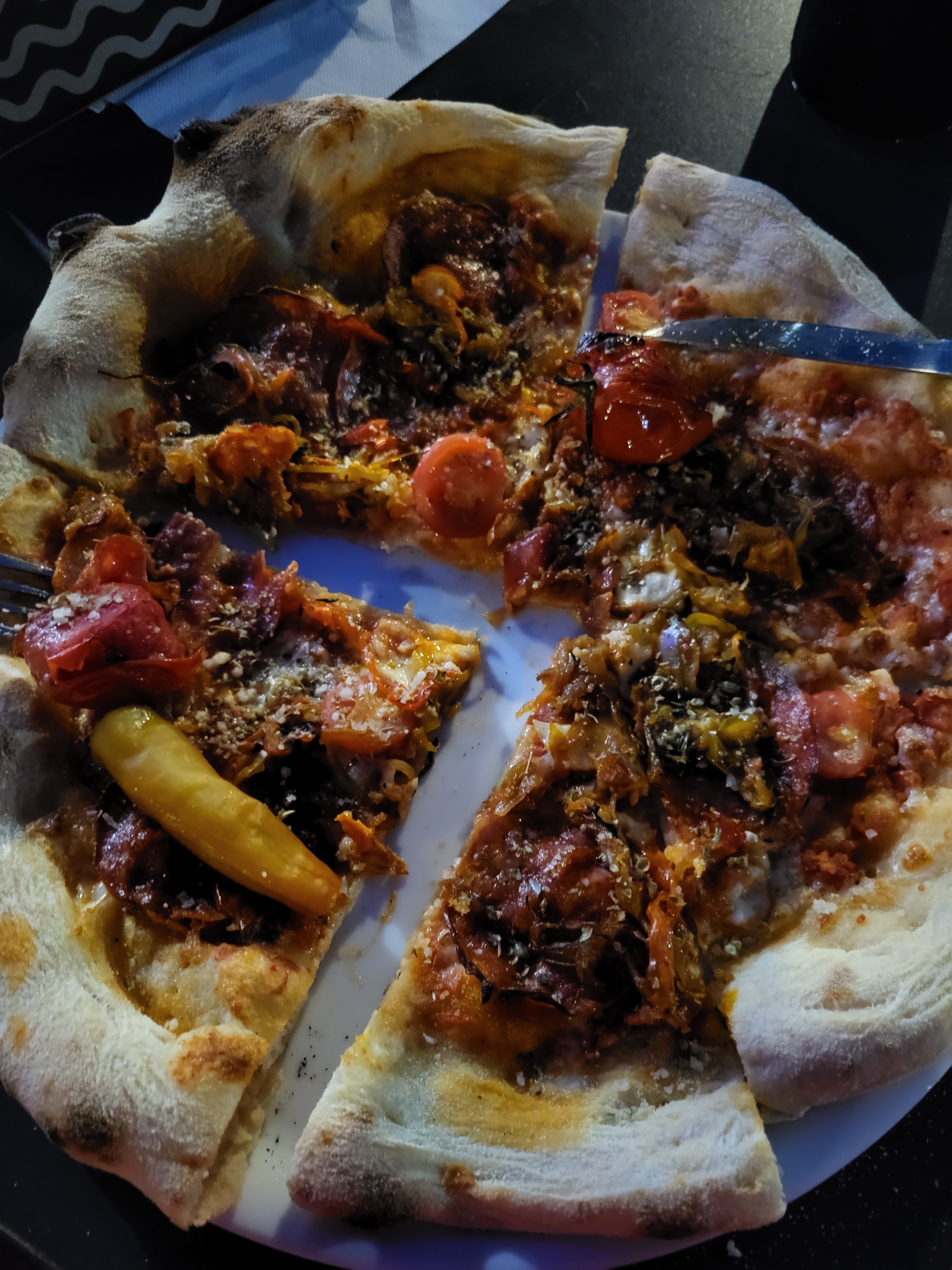 Les pizzas sont vraiment bonnes, la pâte est super, le bémol c'est l'épaisseur de la croûte sur le tour. Il y a bien 3 à 5 cm de pâte sans garniture. Elle a bon être très bonne, ça en fait beaucoup quand même ! À mon goût, il manque un peu de garniture. La bolo est très bien cuisinée et délicieuse comme les confits d'oignons ou poivrons.