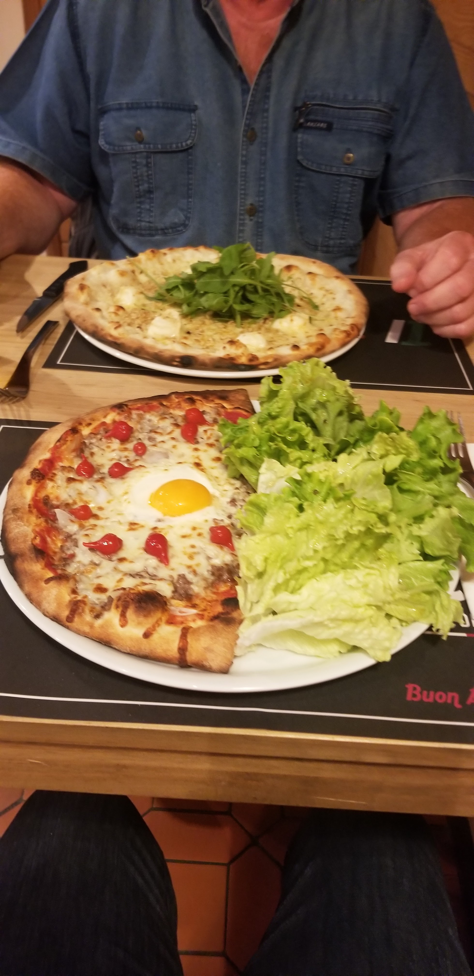 Déçus. Nous n'avons pas apprécié les pizzas que l'on a trouvées chères et sans saveur. La pâte n'est pas bonne (comme du carton) et elles n'étaient pas bien garnies (trop d'oignons crus, seulement 5 tout petit morceaux d'aubergine, pas d'herbes aromatiques ou trop peu). J'ai trouvé la décoration vieillotte. En revanche, le personnel est très sympathique.