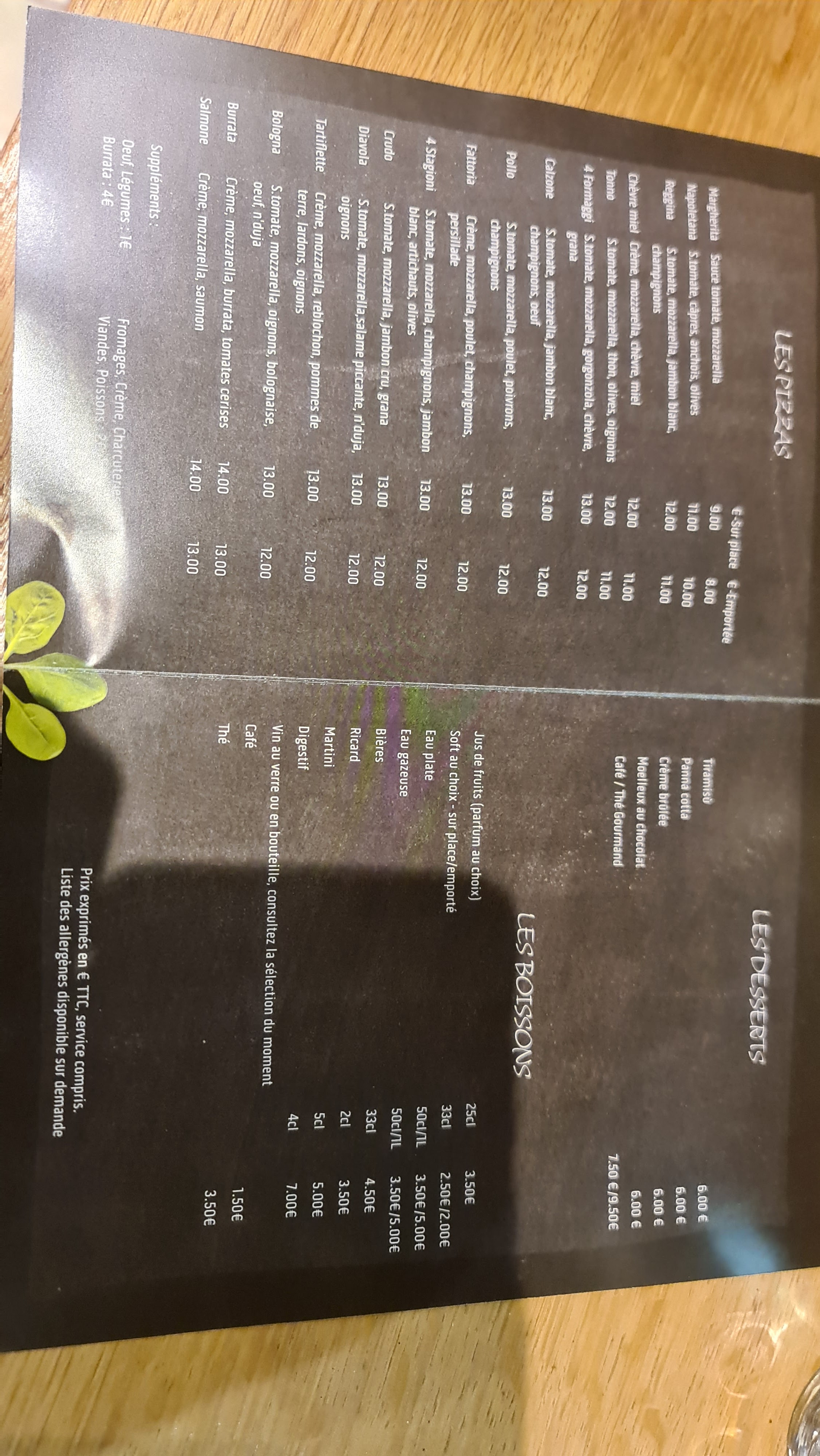 A EVITER ABSOLUMENT Les pizzas sont bonnes mais c'est bien le seul point positif de ce lieu... Un service pitoyable où vous serez agressés et bousculés par la serveuse tout le long du repas. Plus d'une heure d'attente entre la commande et le service a table malgré le peu de monde en salle. Une carte des vins inexistante. La serveuse viendra vous voir pour vous demander de vous dépecher de manger car elle à d'autres personnes qui attendent. Elle répète l'opération à chaque table de clients... Quelle honte. Vous serez mis dehors avant d'avoir pu regarder la carte des desserts. Très mauvaise expérience. Faites attention à ne pas vous faire arnaquer sur la note en partant car ils ne savent pas compter et vous ajoutent des prestations que vous n'avez pas eu. Ce qui fait le plus mal, c'est de voit inscrit sur la note prix nets service compris... pour la mauvaise qualité du service et de l'acceuil, ça fait mal au coeur de payer le prix fort.