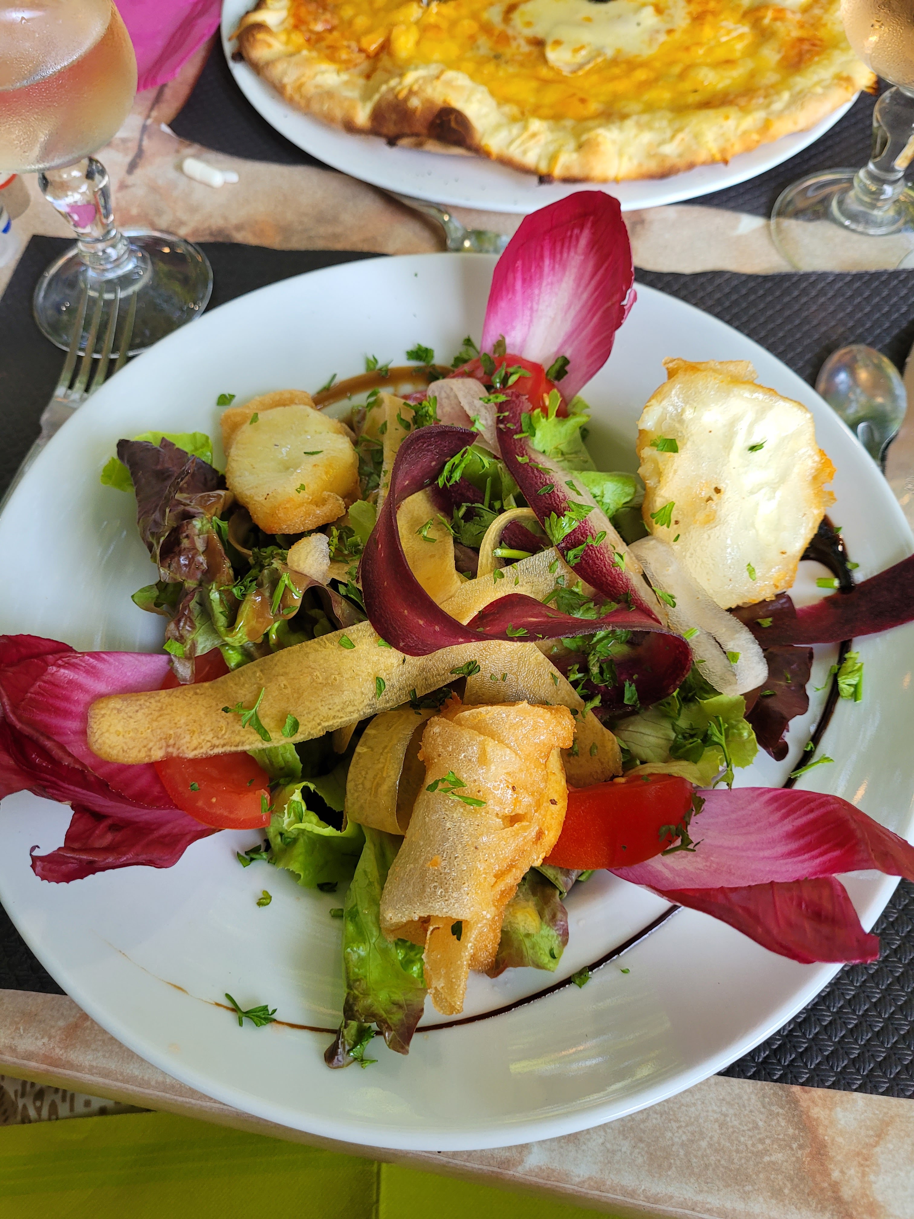 Très bonne salade végane: variée, fraîche et généreuse. Une belle surprise dans ce village où les options végétariennes et véganes se font rares! Les pizzas sont aussi très goûteuses et croustillantes. On sent que les produits sont de qualité. Nous y avons été en pleine saison touristique et l’endroit était complet, ce qui rendait le service un peu lent; l’attente vaut la peine si vous n’êtes pas pressé.e.
