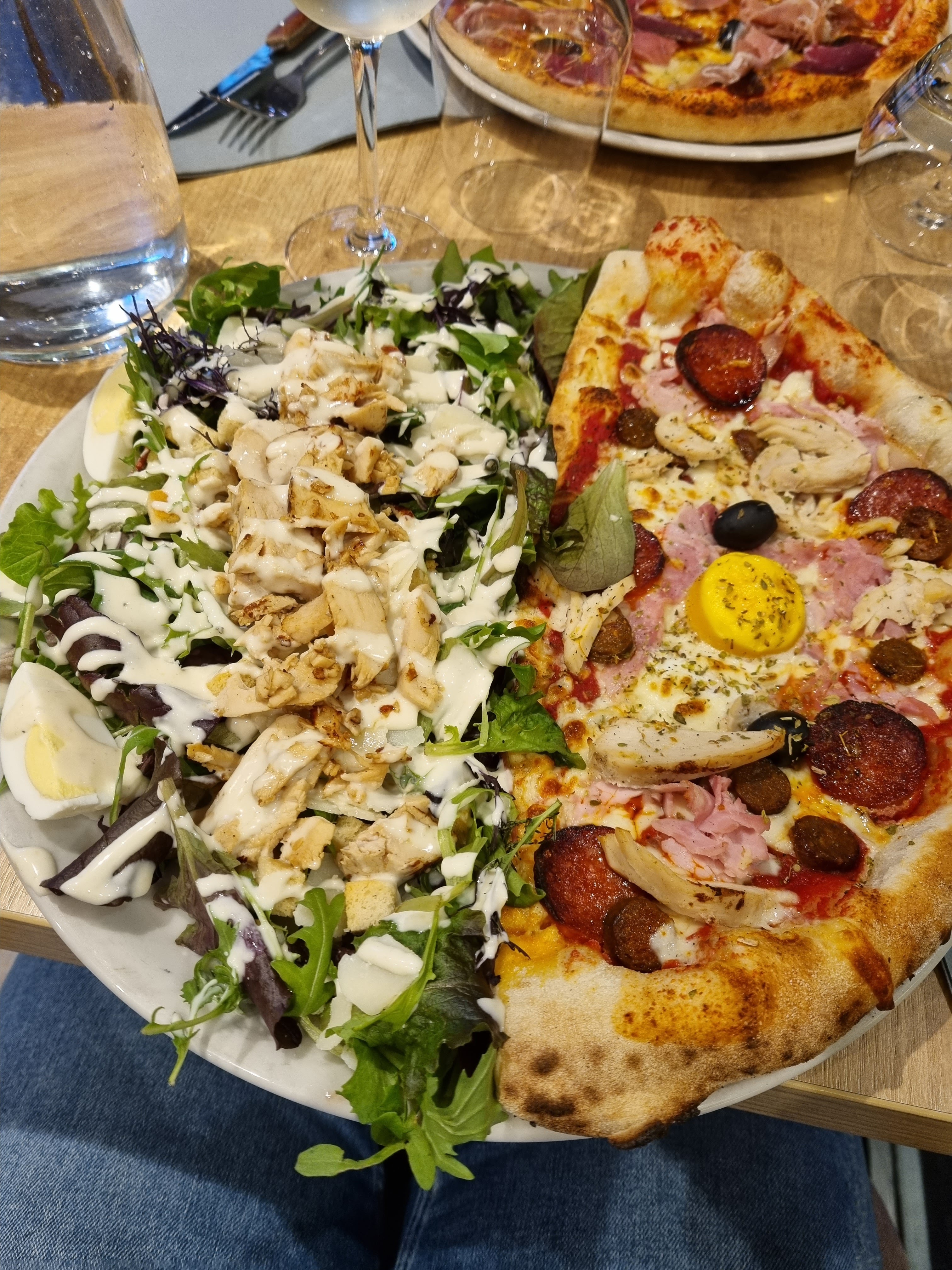 Venue à 4 aujourd'hui, très bien accueilli, les 2 serveurs très aimable, la déco super jolie simple sobre efficace Nous avons choisi le mezzo mezzo( moitié salade moitié pizza) et bah super copieux, les pizzas sont très bonnes, la pâte est croustillante, les salades sont très bonnes aussi. Pas du tout déçue