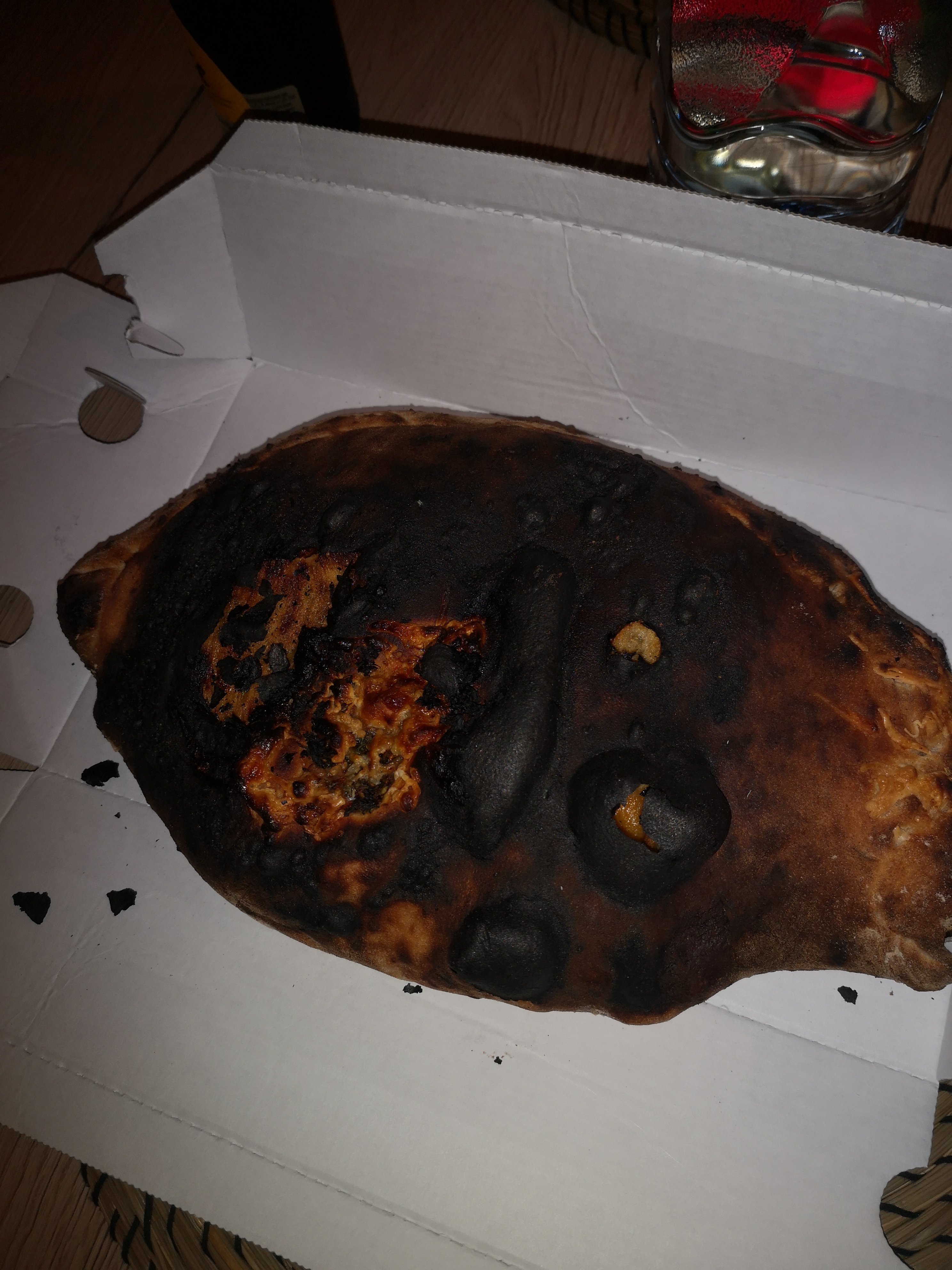 Commande à emporter hier soir pour 5 personnes. Délais d'attente correct. Cependant une fois les boîtes ouvertes en arrivant à la maison, nous remarquons que les bordures des pizzas sont trop cuites et l'extérieure de la Calzone carrément cramée.... Le goût des pizzas reste satisfaisant mais rien d'exceptionnel non plus ...