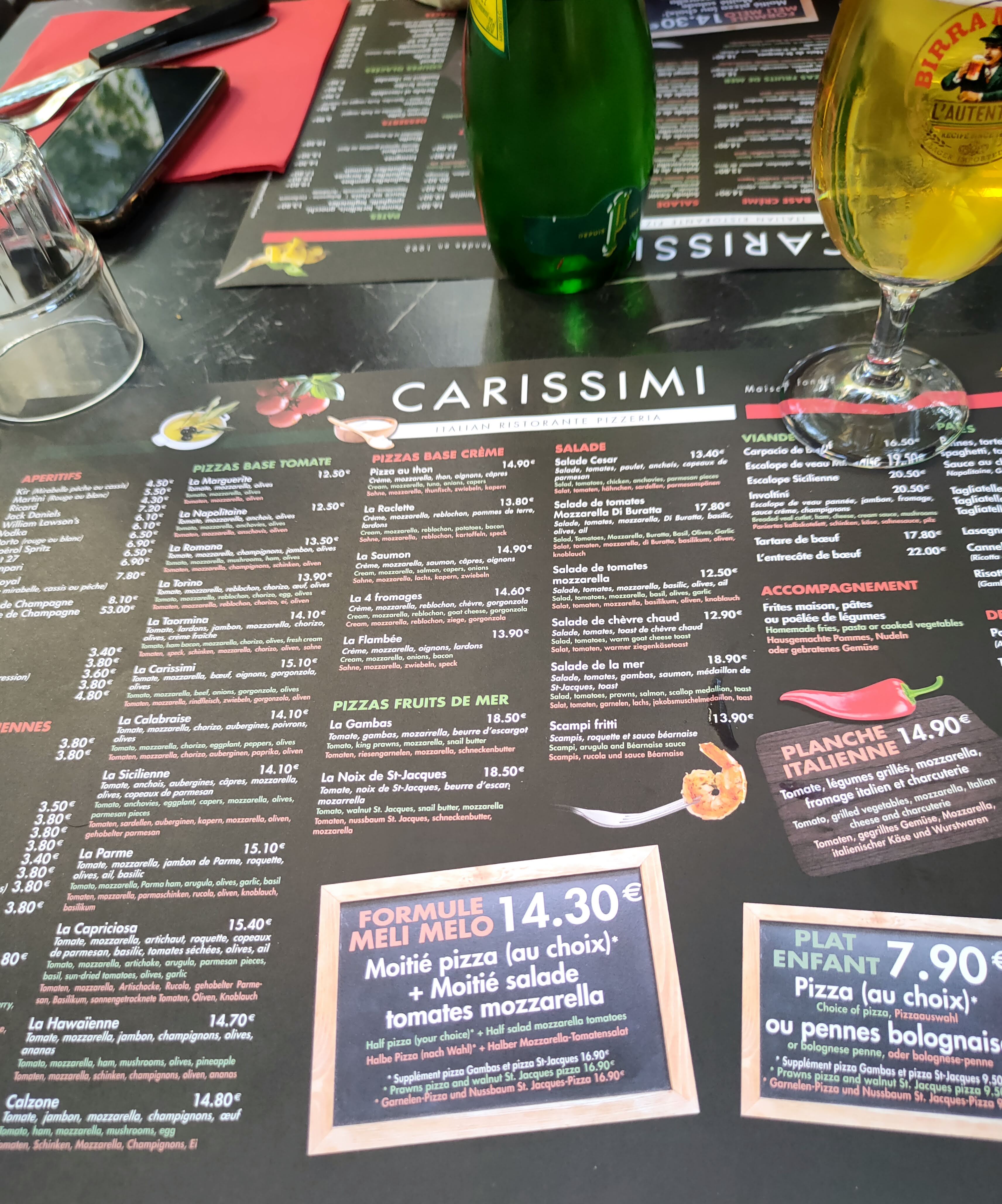 A l'heure où les pizzerias fleurissent à tous les coins de rue, il s'avère important de faire sortir Carissimi du lot, car elle mérite le détour. Dans un décor cinématographique des années 1960-70, vous trouverez des grands classiques habilement travaillés. Il y a un peu d'attente entre la commande et le service, mais vous êtes assuré d'obtenir un plat fraîchement préparé, copieux et savoureux. Avec modération, je recommande le Valpolicella au verre.