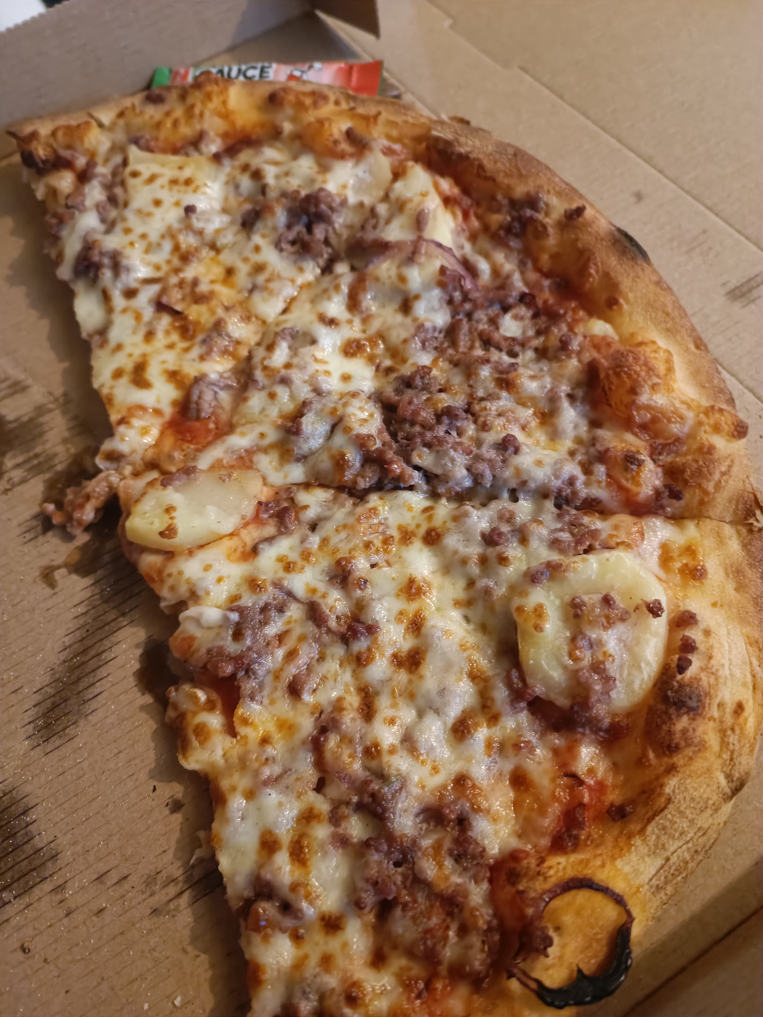 Nous avons commandé plusieurs pizzas et des boissons nous ont même été offertes ! Tout aurait été parfait si je n’avais pas trouvé un morceau de plastique de 3cm entre deux pommes de terres....