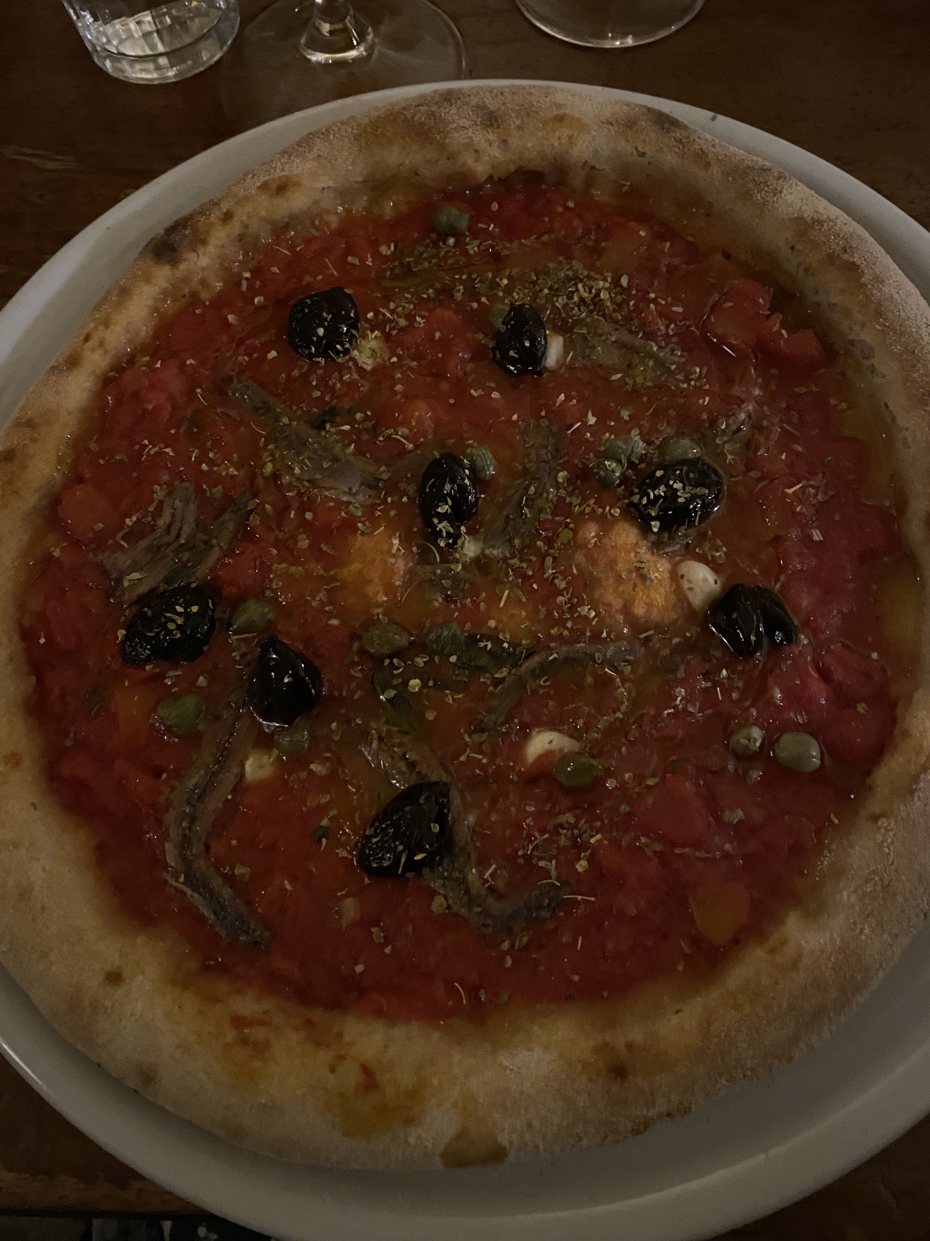 Une petite pizzeria chaleureuse et chaleureuse servant des pizzas à pâte fine de style napolitain. De plus, on peut choisir des pâtes, et pour le dessert, même du tiramisu. De plus, nous pouvons commander du vin italien. Je me suis laissé tenter par la pizza napolitaine aux anchois, sauce tomate et olives noires. Super pizza. Je recommande.